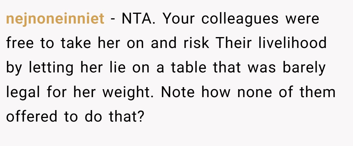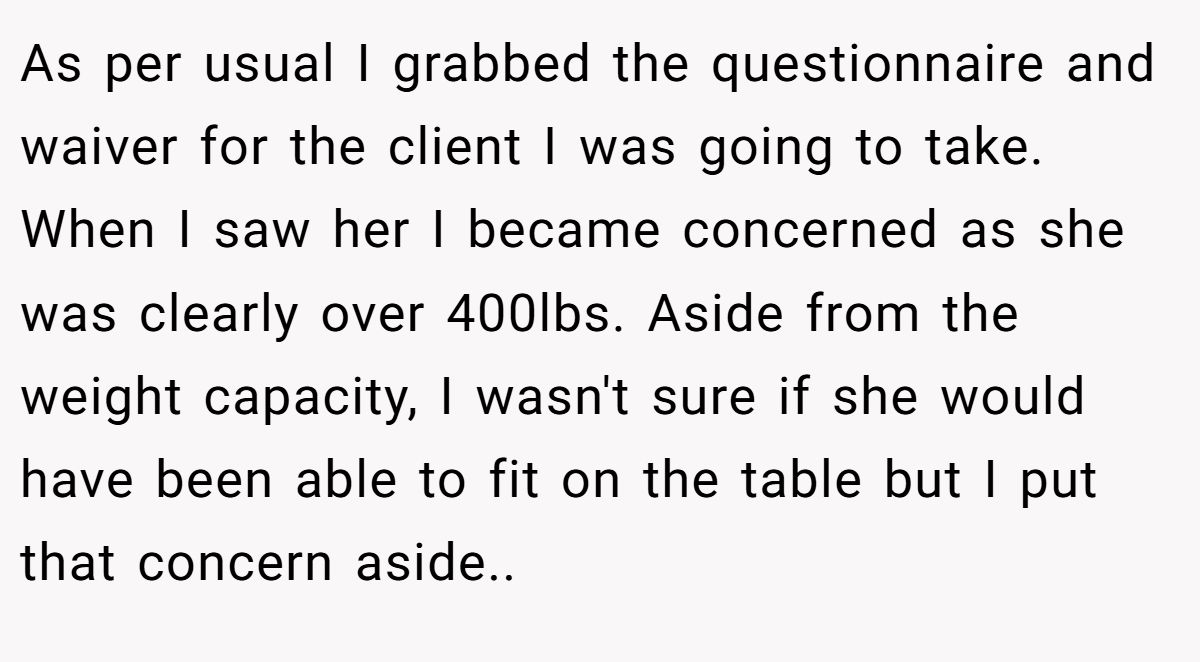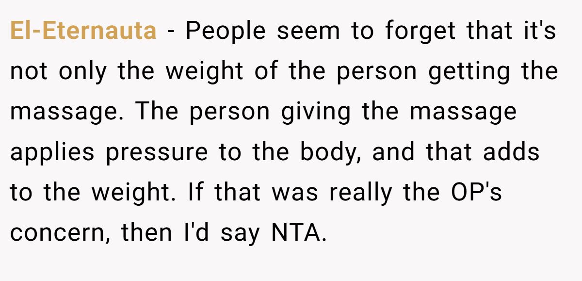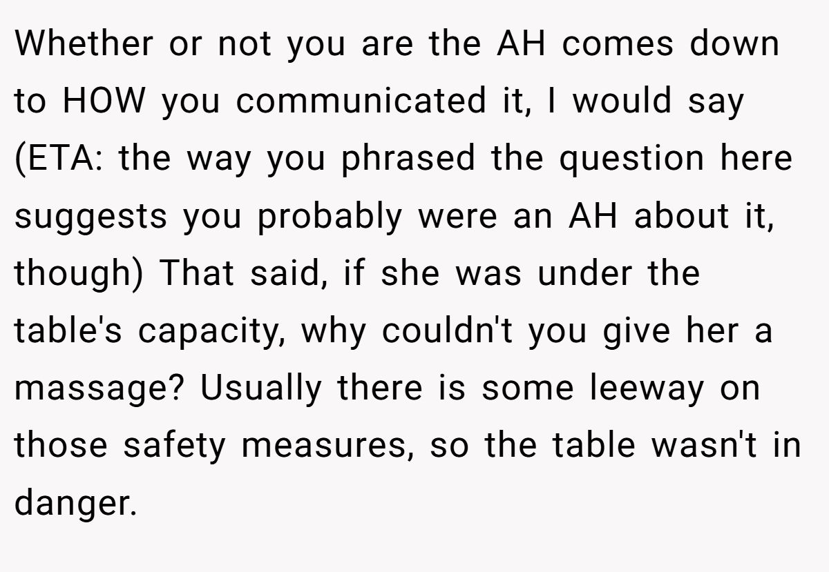 Handling client care in physical wellness settings often requires a balance of safety, compassion, and tact. In this scenario, the masseur faced a very real logistical issue: a weight limit that, if exceeded, could cause serious injury or damage—not just embarrassment. As many commenters pointed out, applying pressure during a massage increases strain on the table. It’s not just about the person’s static weight; it’s the dynamic force of the session itself.