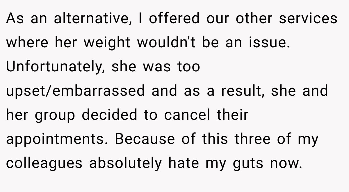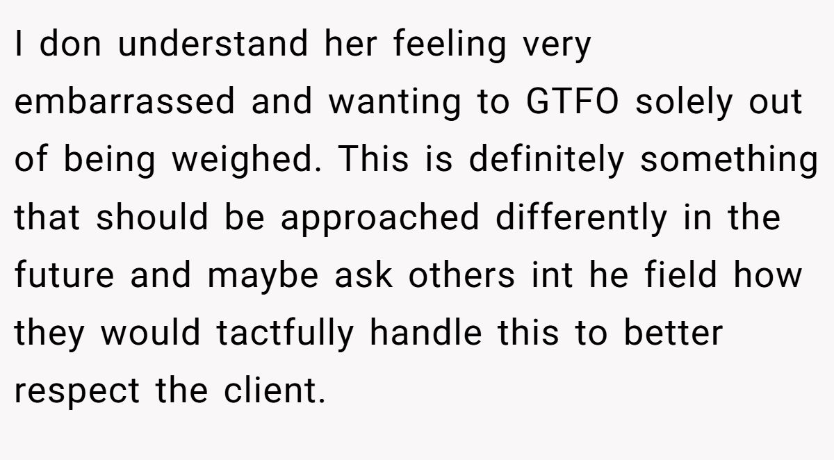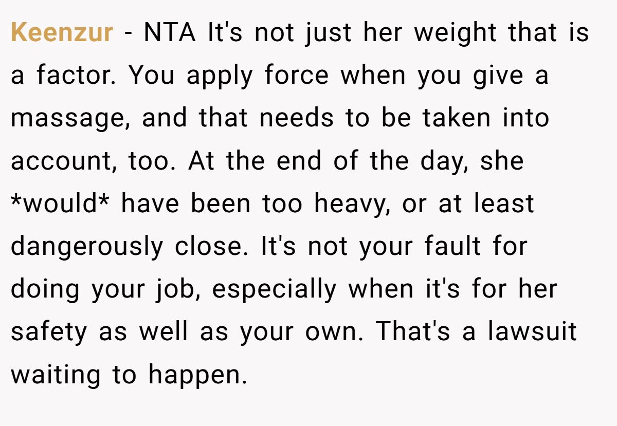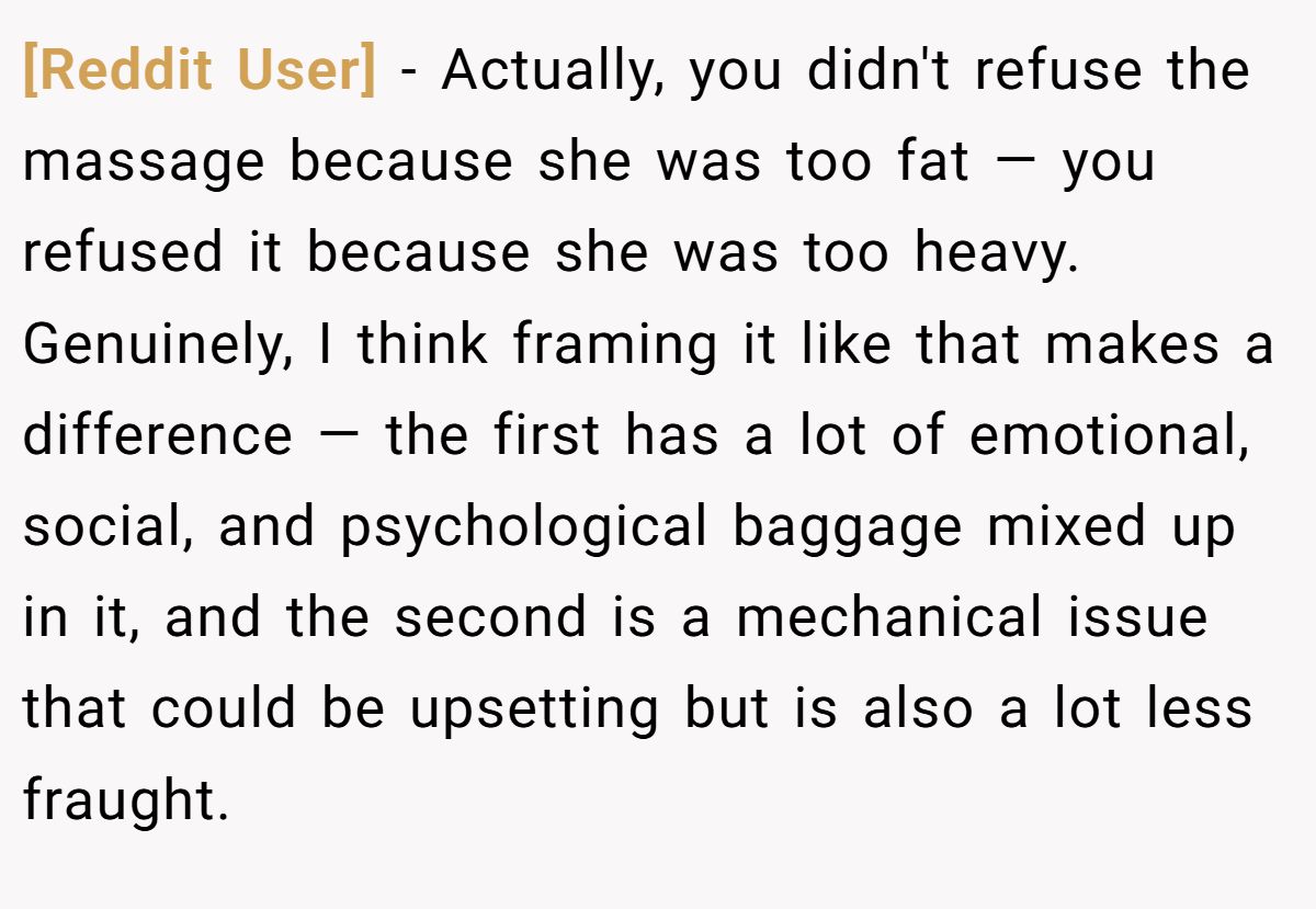 Still, as one Redditor noted, the delivery matters. Telling someone they’re “too fat for a massage” sounds callous. Saying, “I want to ensure your comfort and safety, and our current equipment might not support the pressure properly,” lands differently. Emotional intelligence matters as much as technical knowledge in client-facing roles.