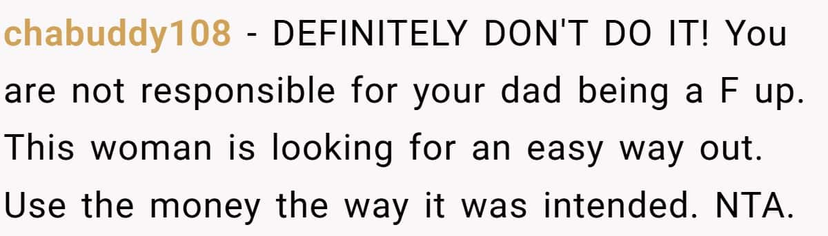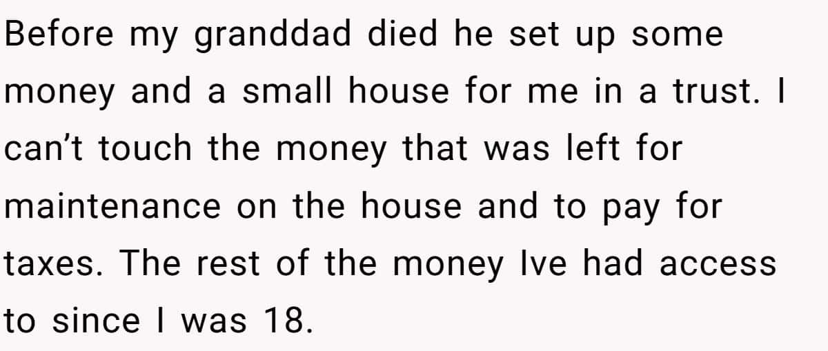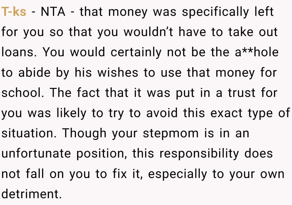 Inheritance comes with emotional strings. Dr. Pauline Boss, a family therapist, noted in a 2023 Psychology Today article, “Designated funds, like for education, carry a donor’s intent, and deviating can feel like betrayal”. The Redditor’s granddad set up the trust to keep her loan-free, a clear wish she’s honoring. Stepmom’s financial bind, worsened by dad’s unreliability, isn’t the Redditor’s burden, despite the sob story.