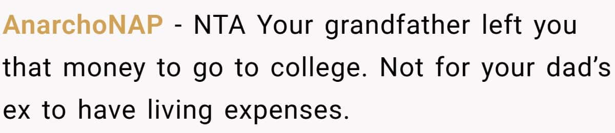 Reddit was crystal clear: You’re not selfish for protecting what your grandfather left you. You’re responsible. That college money isn’t just financial aid—it’s a ticket to a better life, unchained from the same cycles that left your dad and his partners in chaos.
