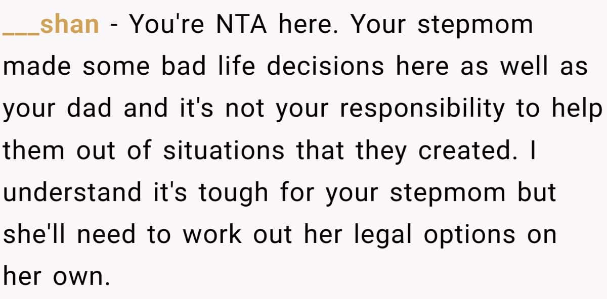A large group of users argued that OP isn’t responsible for cleaning up the mess her father and stepmom created