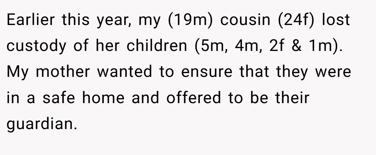 Imagine walking into your childhood home expecting warmth and instead stepping into what feels like a full-time daycare on the edge of collapse. That’s what happened to this 19-year-old Redditor. His mom took in four of his cousin’s kids (ages 1 to 5) after their mother lost custody.