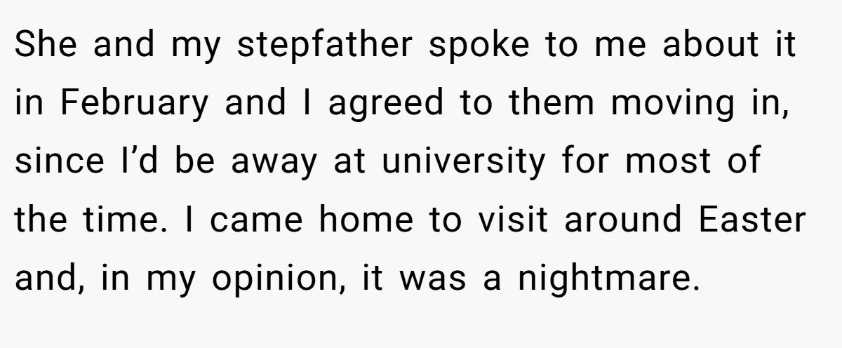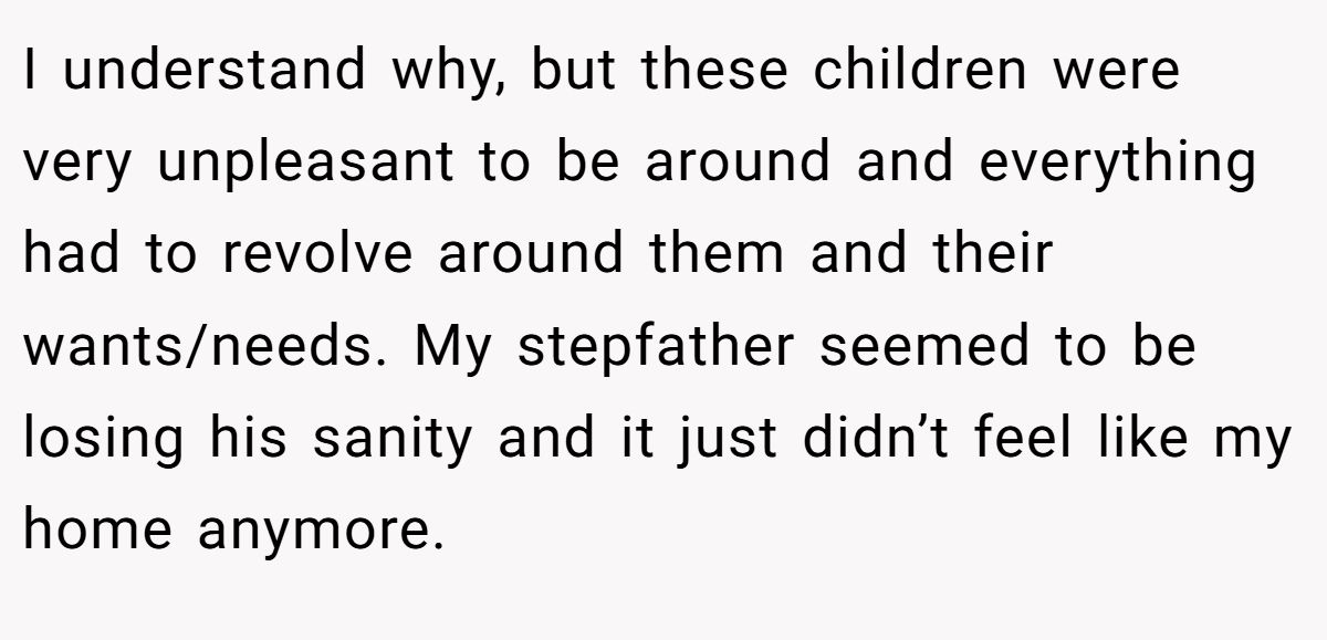 He agreed to it in theory, after all, he’d be away at university. But an Easter visit shattered that idea fast. His room had been given away, his belongings were stuffed into the attic, and every waking moment revolved around loud, needy, emotionally overwhelmed children. His stepfather looked like he hadn’t slept in days. This wasn’t “home” anymore, it was survival mode.