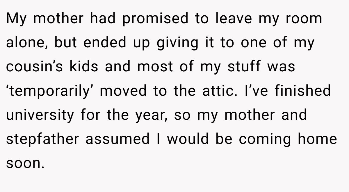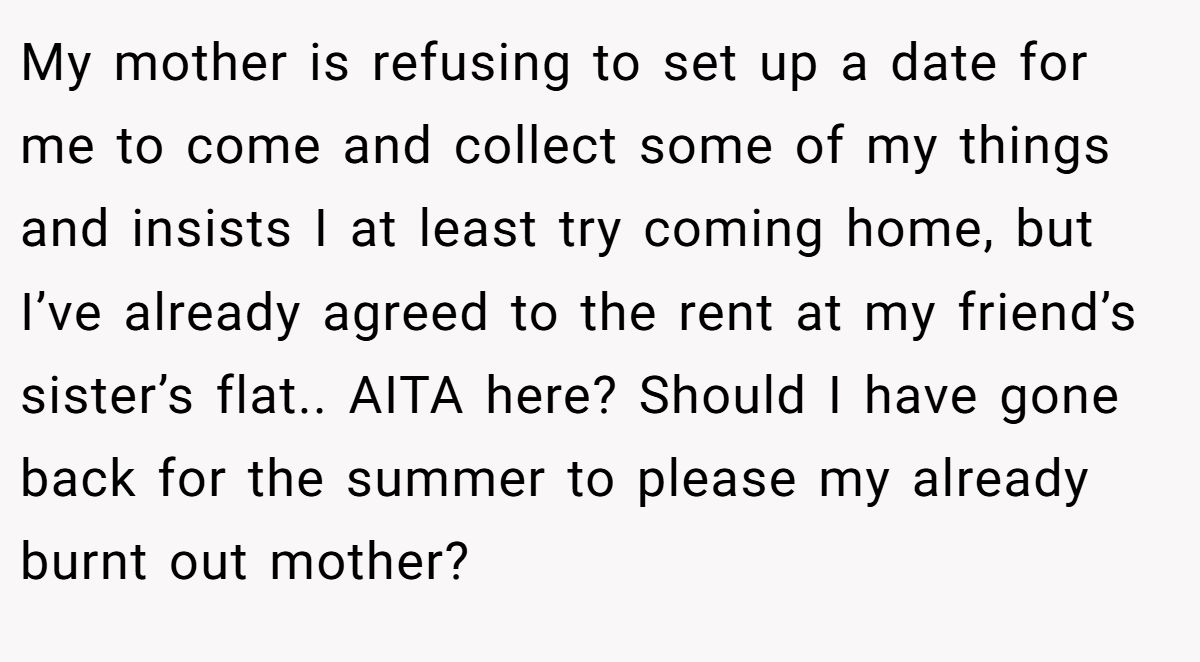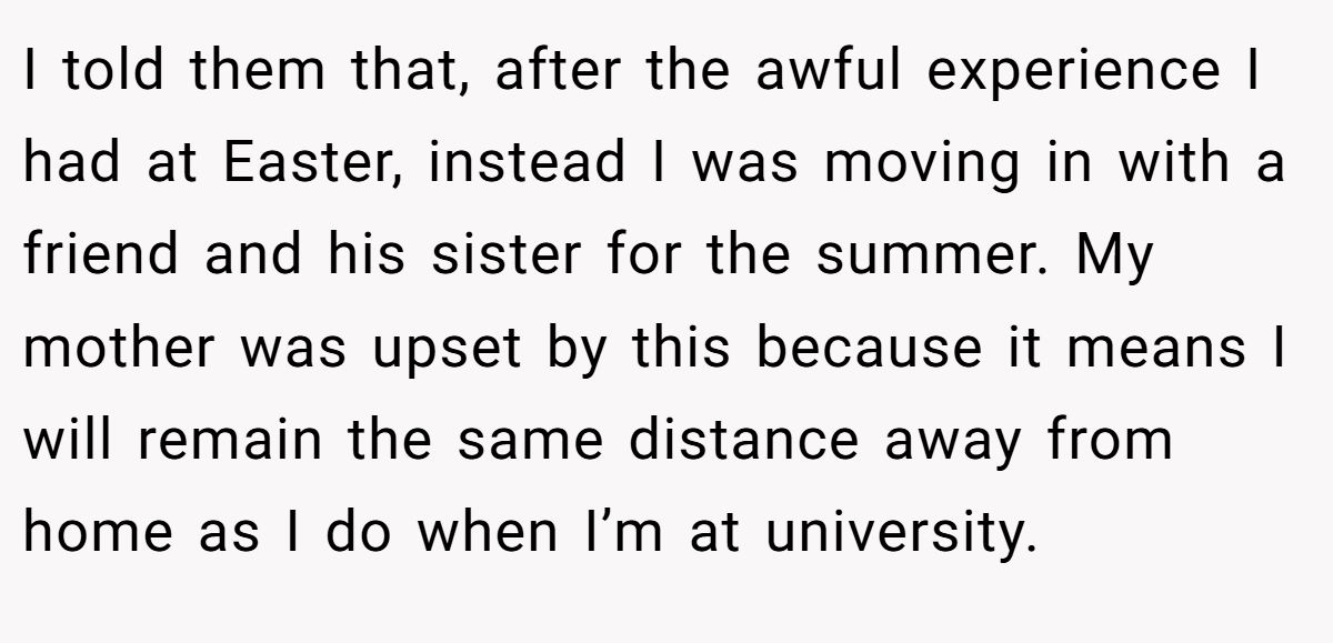 So when summer rolled around, he made a choice: skip the trip home, rent a flat with friends, and protect his peace. Now his mom is devastated, his stepdad is furious, and Reddit is split. Is he abandoning his family when they need him most or just trying to survive the storm?