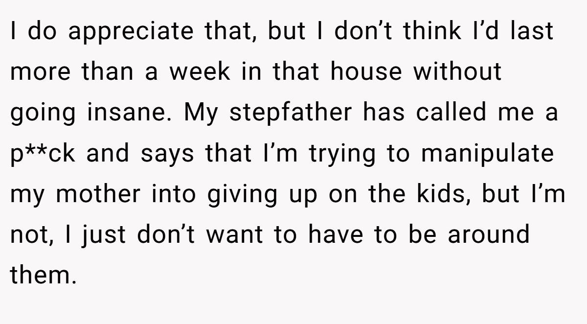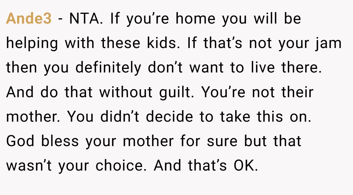 Ande3 made it clear this wasn’t OP’s burden to carry. They pointed out that if he came home, helping with the kids would be inevitable, whether he liked it or not. And since he didn’t choose this new reality, there’s no guilt required. Supporting your mom doesn’t mean sacrificing your sanity, and in this case, distance might be the only healthy boundary.
