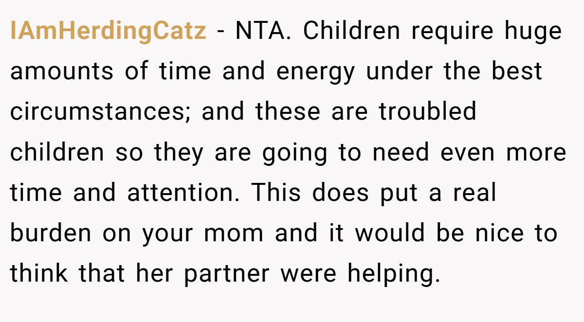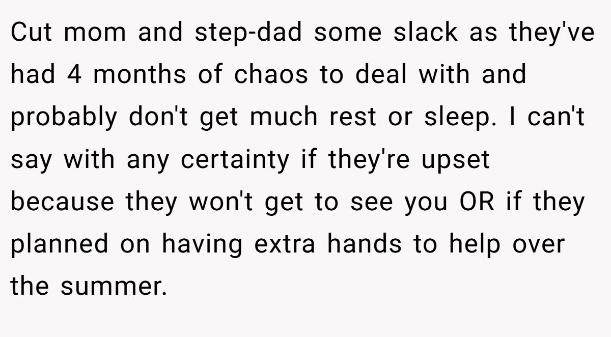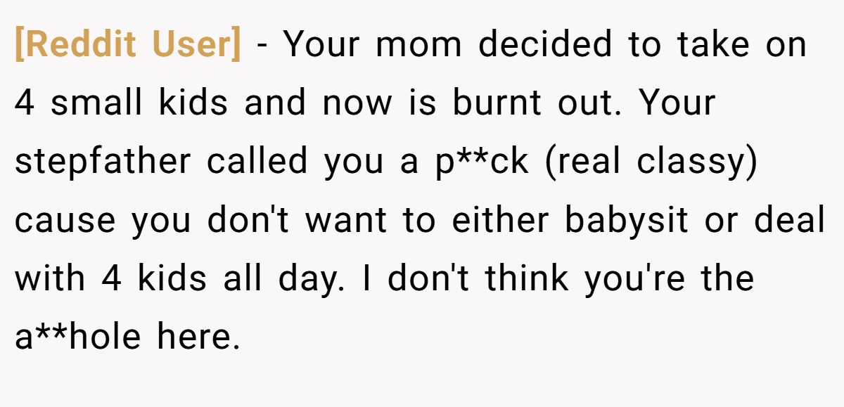 At first glance, it’s easy to label him selfish. His mom didn’t create this mess for fun. She stepped up to protect her niece’s children, and all she asked was for her son to come home for the summer. That doesn’t seem like much. Plus, his stepfather’s frustration, though harsh, might come from genuine burnout. Parenting four toddlers isn’t just tiring; it’s mentally draining. Maybe they hoped for solidarity, just a little presence, from the young man they raised.