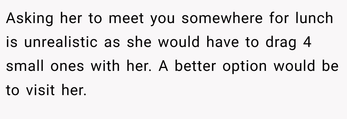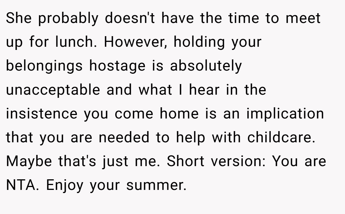 Some commenters suspected this wasn’t just about a mom missing her son — it felt more like a silent plea for backup. One user, IAmHerdingCatz, suggested that the refusal to let him retrieve his belongings might be a subtle tactic to lure him back home to help with the kids.