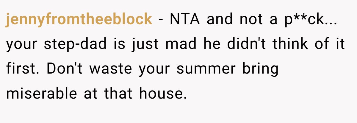 jennyfromtheeblock didn’t hold back, taking a jab at the stepfather’s bitterness and fully backing the Redditor’s escape plan.