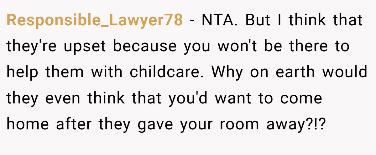 Responsible_Lawyer78 cut right to the heart of the matter, pointing out the glaring contradiction: how could anyone expect him to feel welcome after they reassigned his bedroom? In their eyes, the frustration wasn’t about missing him—it was about losing a much-needed extra pair of hands.