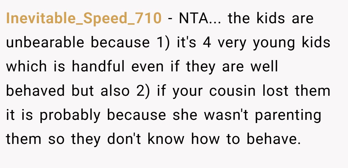Inevitable_Speed_710 offered a firm reality check, suggesting the chaos wasn’t just about the number of kids—but the deeper reason behind it. They pointed out that if the cousin lost custody, it’s likely the children came with serious behavioral baggage, which would make the home environment even harder to tolerate.