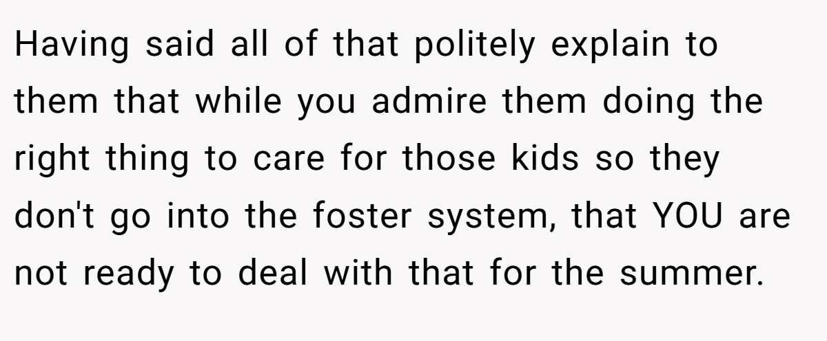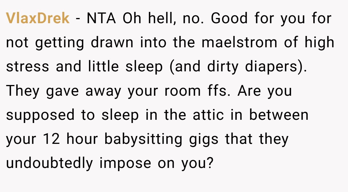 VlaxDrek painted the home like a pressure cooker, loud, chaotic, and running on no sleep. By pointing out that even the Redditor’s bedroom had been reassigned, they questioned where exactly he was expected to rest while likely being roped into exhausting babysitting duties all summer.