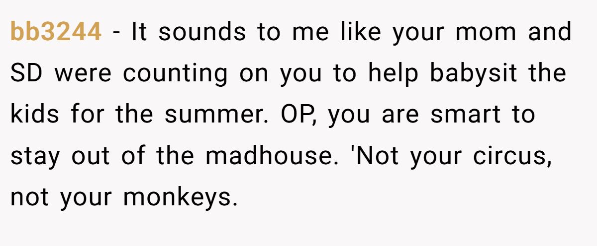 bb3244 implied the entire setup felt like a trap disguised as a family reunion. From their perspective, it seemed obvious the mom and stepdad were relying on OP to step in as a free babysitter. Choosing to stay away wasn’t selfish. It was a smart move to avoid being pulled into a chaotic situation he didn’t sign up for.