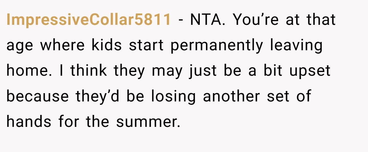 ImpressiveCollar5811 offered a more empathetic lens, suggesting the parents might not just be overwhelmed—they could be grieving the subtle loss of their almost-grown son. At 19, it’s natural to begin carving out your own space, but when a household suddenly needs all hands on deck, that independence can feel like abandonment to those left behind.