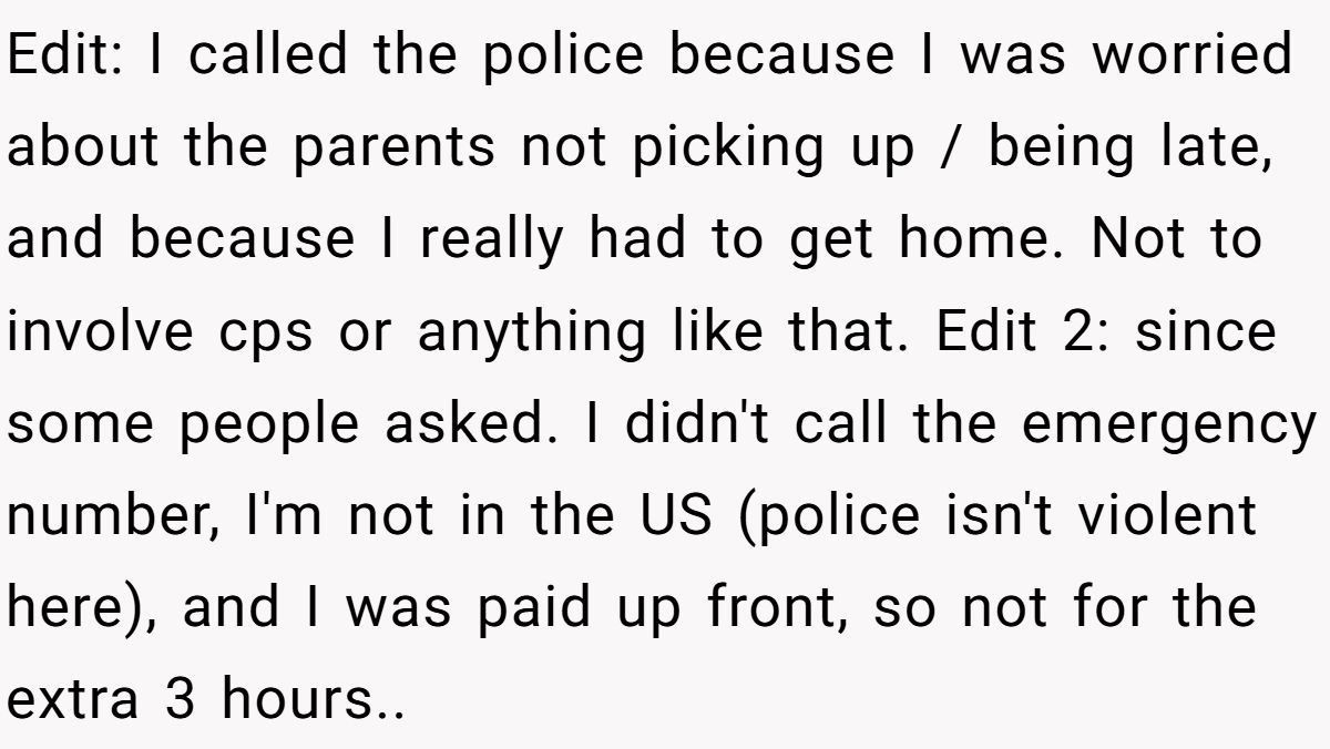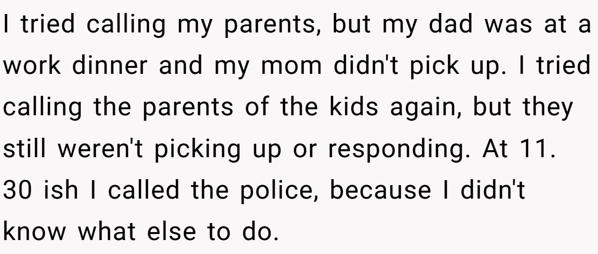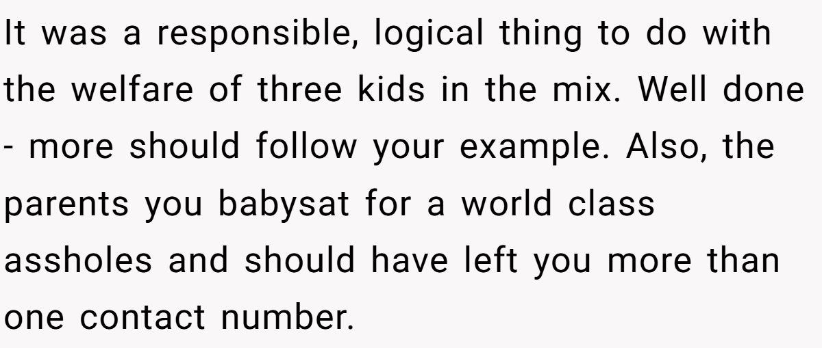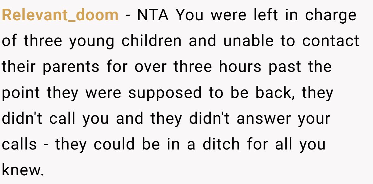 One Reddit User said OP acted responsibly and logically by calling the police, especially after being unable to reach the parents for over three hours while caring for three young children