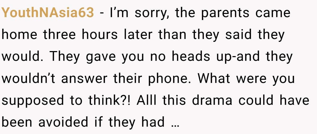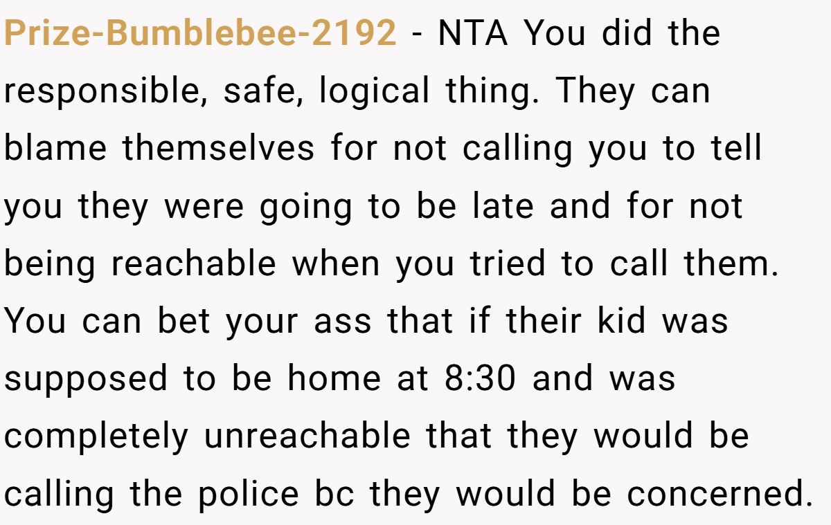 Another praised OP’s instincts, calling her actions logical and responsible given how long the parents were gone