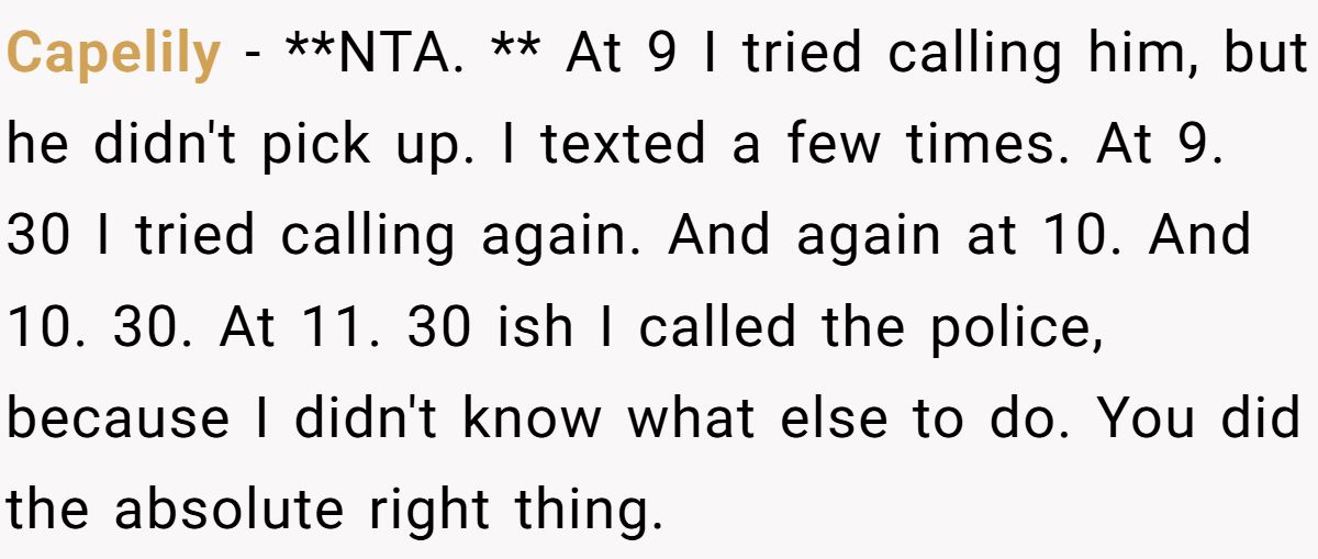 This commenter stated that being three hours late without communication was more than enough reason to involve the police