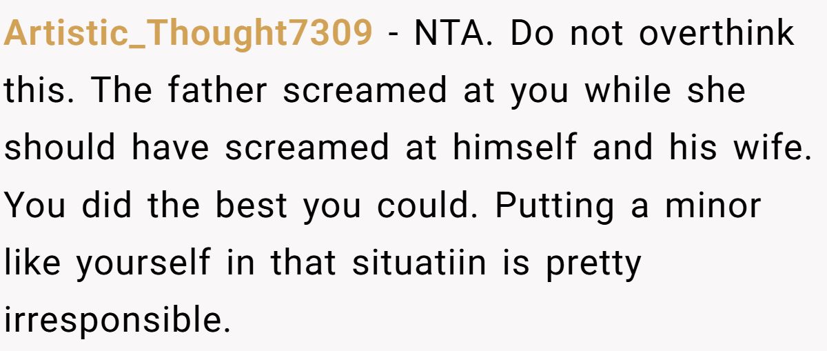 Another said OP did the best she could and criticized the parents for putting a minor in such an irresponsible position