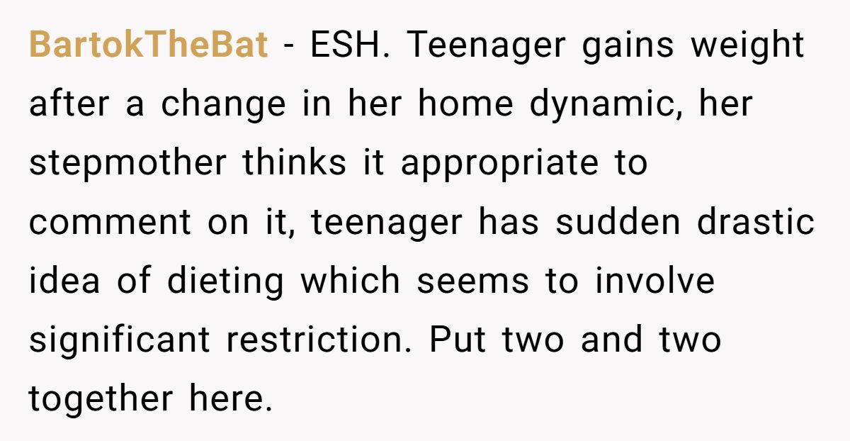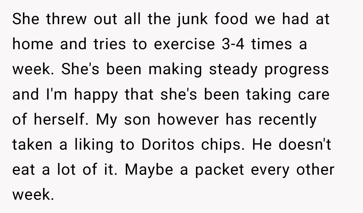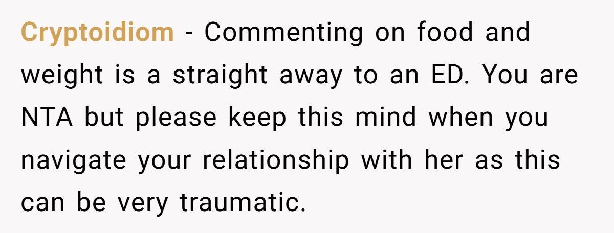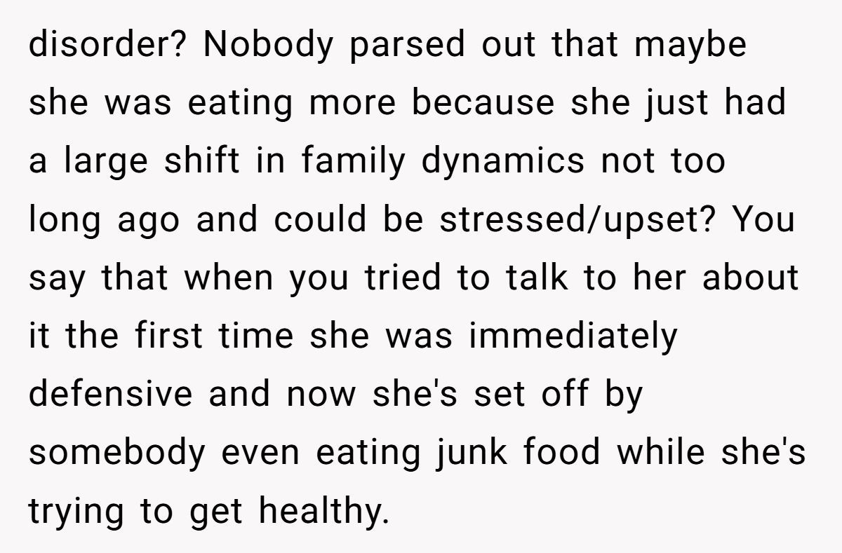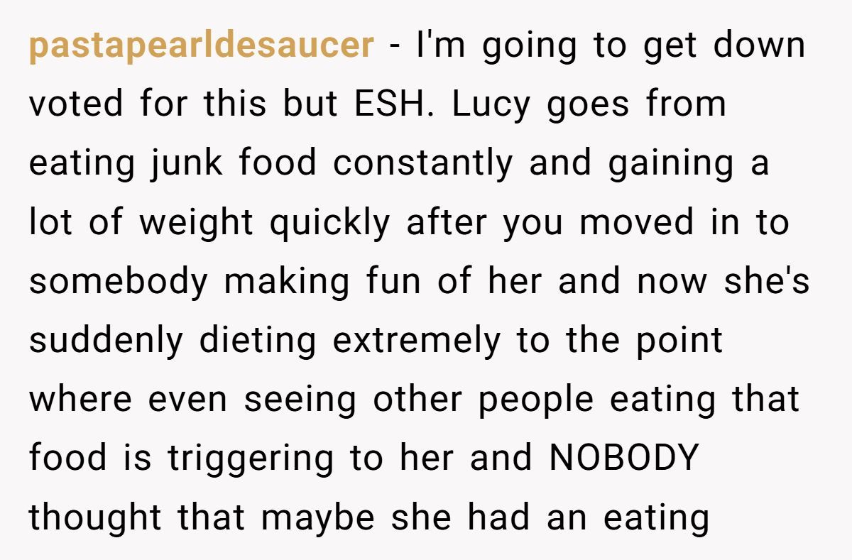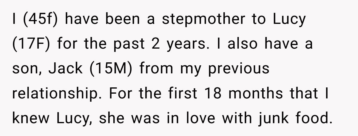 Lucy’s behavior—bingeing on junk food after a family change and now banning it entirely—suggests possible emotional distress, potentially exacerbated by the stepmom’s earlier comments about her eating habits. While Lucy’s demand to control the household’s food was unreasonable, the Redditor’s harsh words may have deepened her insecurity, especially at 17, a critical age for body image development.