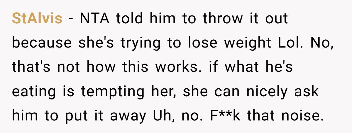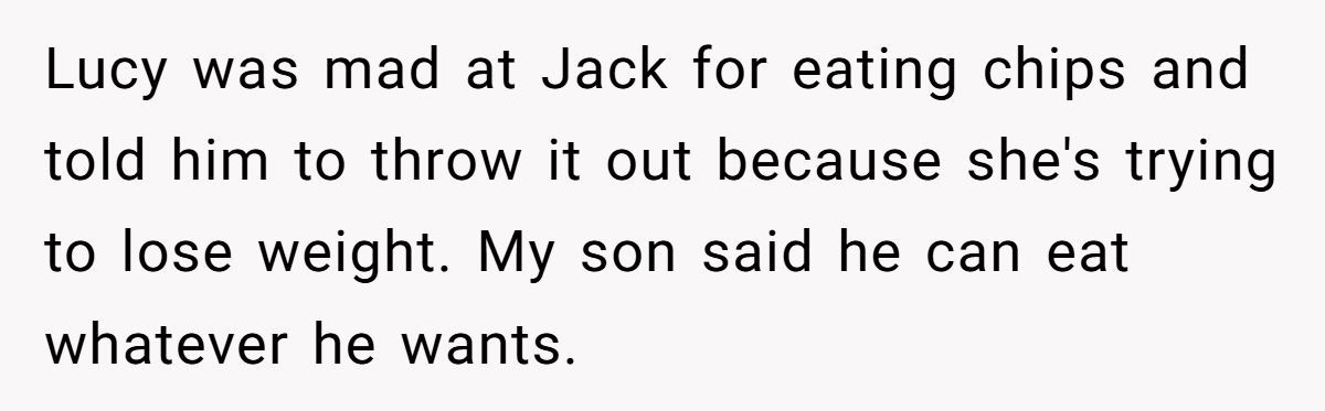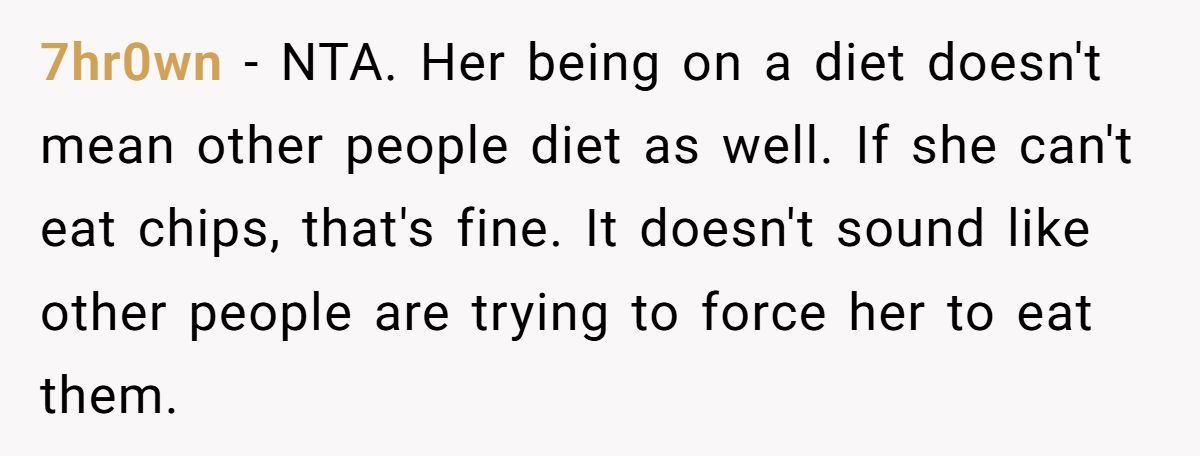 This Redditor, a 45-year-old stepmom, was justified in telling her stepdaughter, Lucy, that she can’t control what others eat in their shared home, especially after Lucy demanded her stepbrother throw out his Doritos to avoid tempting her diet. However, her blunt delivery—“grow up” and “not everyone will follow your diet”—may have escalated the conflict, especially given Lucy’s recent shift from unhealthy eating to restrictive dieting, triggered by a cruel school insult.