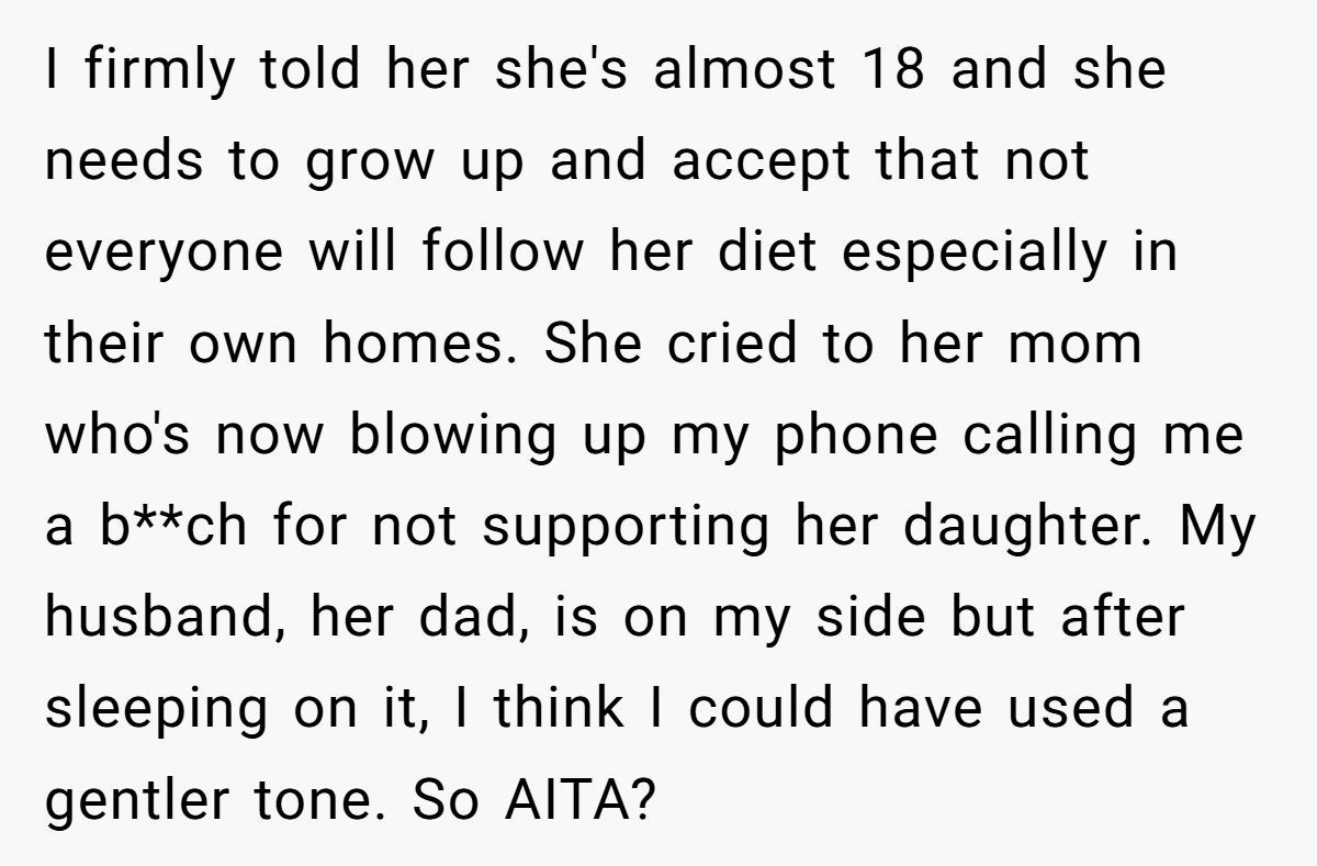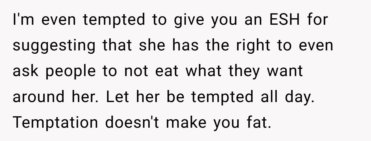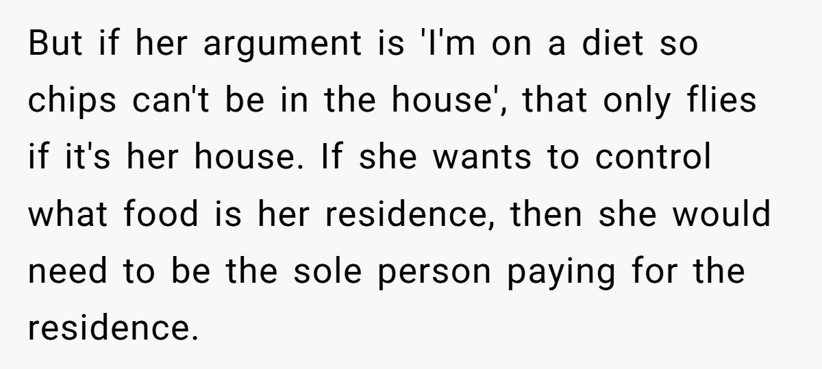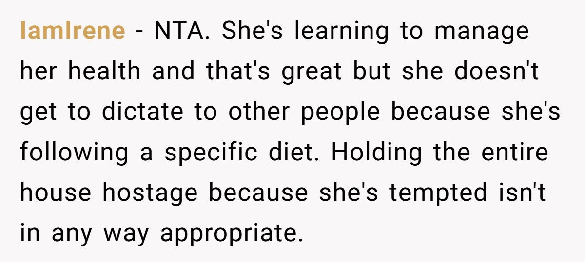 Supporting someone’s health journey doesn’t mean letting them control your kitchen. The OP may have delivered her message with a bit too much fire, but the sentiment was fair: we all live in the real world, and part of growing up is learning how to manage personal choices without controlling others.