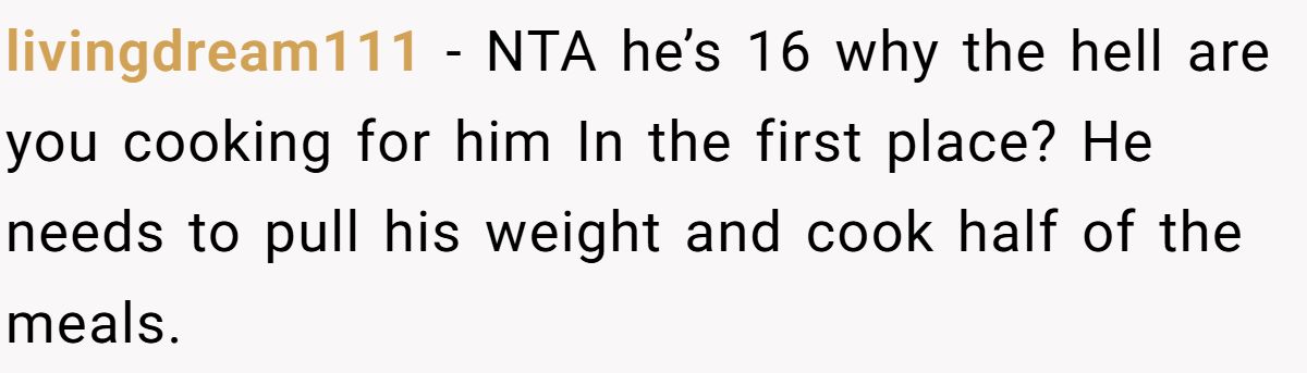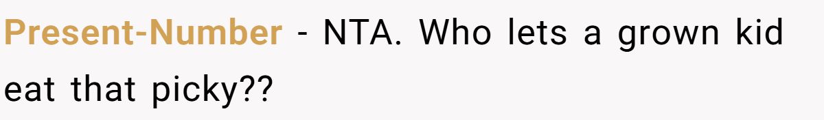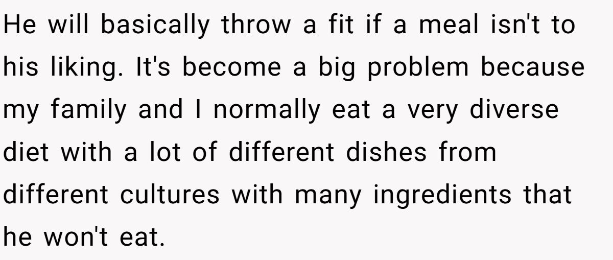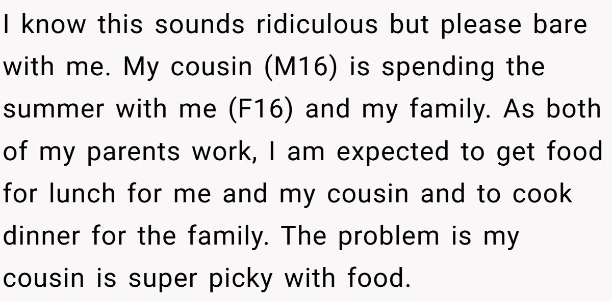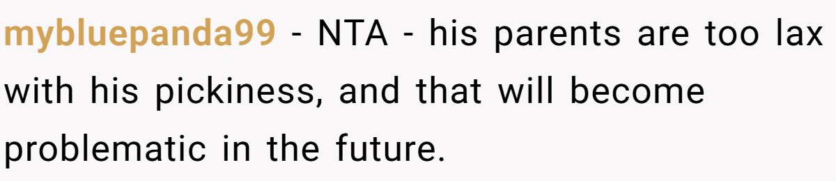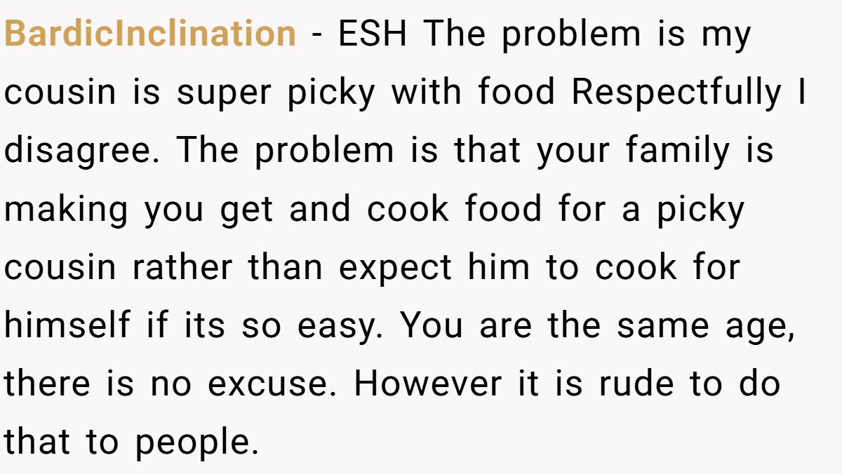 Users slammed the cousin’s pickiness and tantrums, saying his parents enable him and he should cook for himself at 16