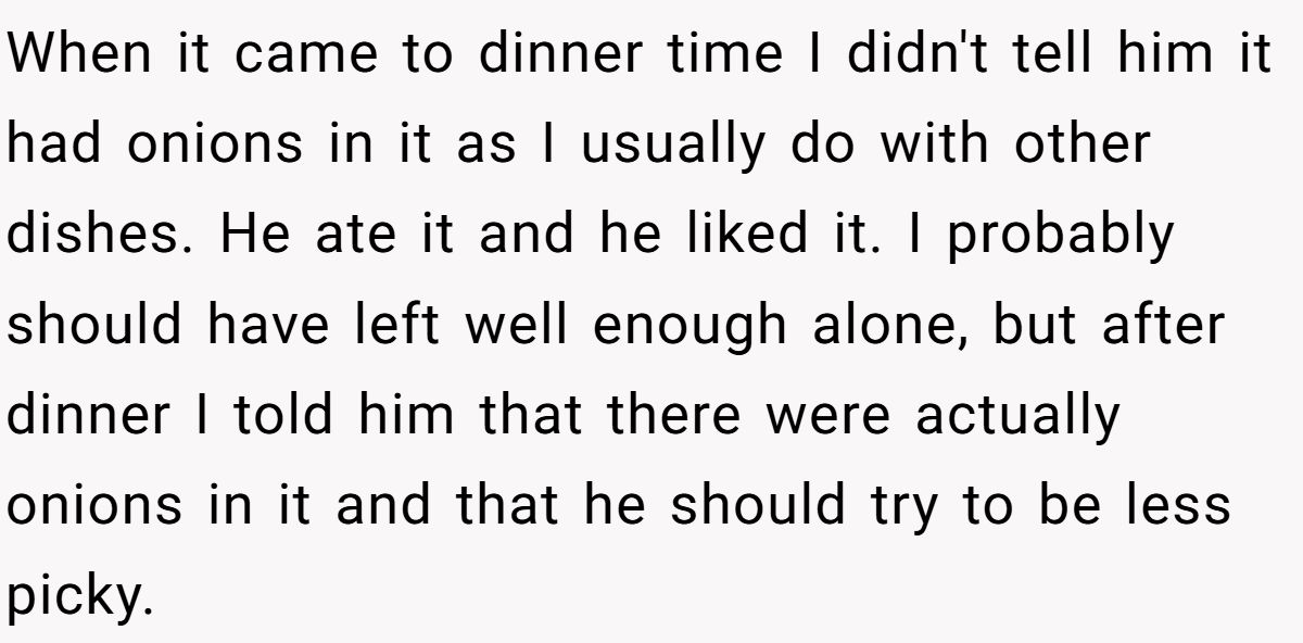 Commenters saw no issue with hiding onions but called the reveal rude, noting it could worsen aversions or make him feel sick