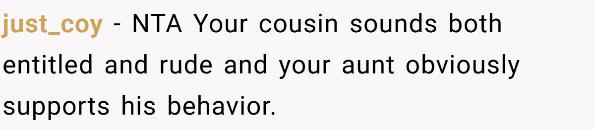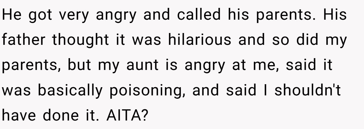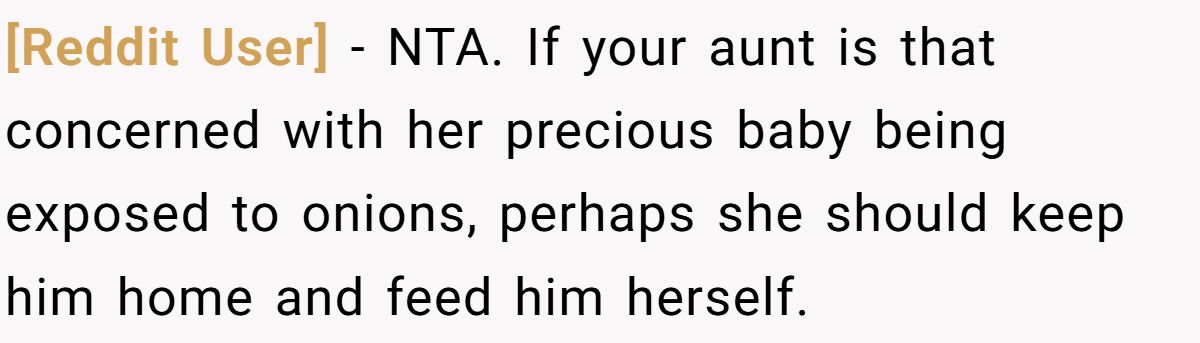 The bigger issue may be emotional maturity. Rather than making his own food or respectfully declining, the cousin threw a fit—then called his parents. The aunt’s reaction, labeling the dish “poison,” only escalated a minor family issue into high drama. Her outrage may stem less from concern and more from being caught off-guard.