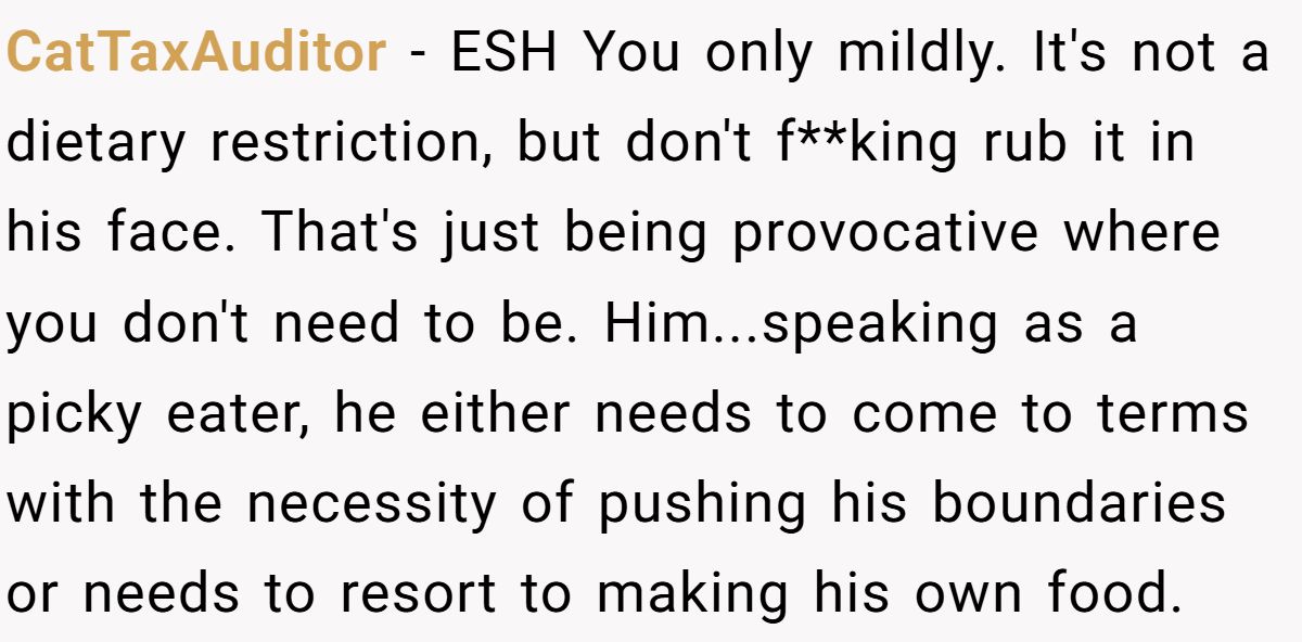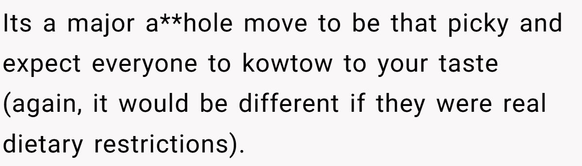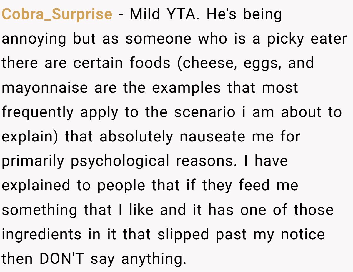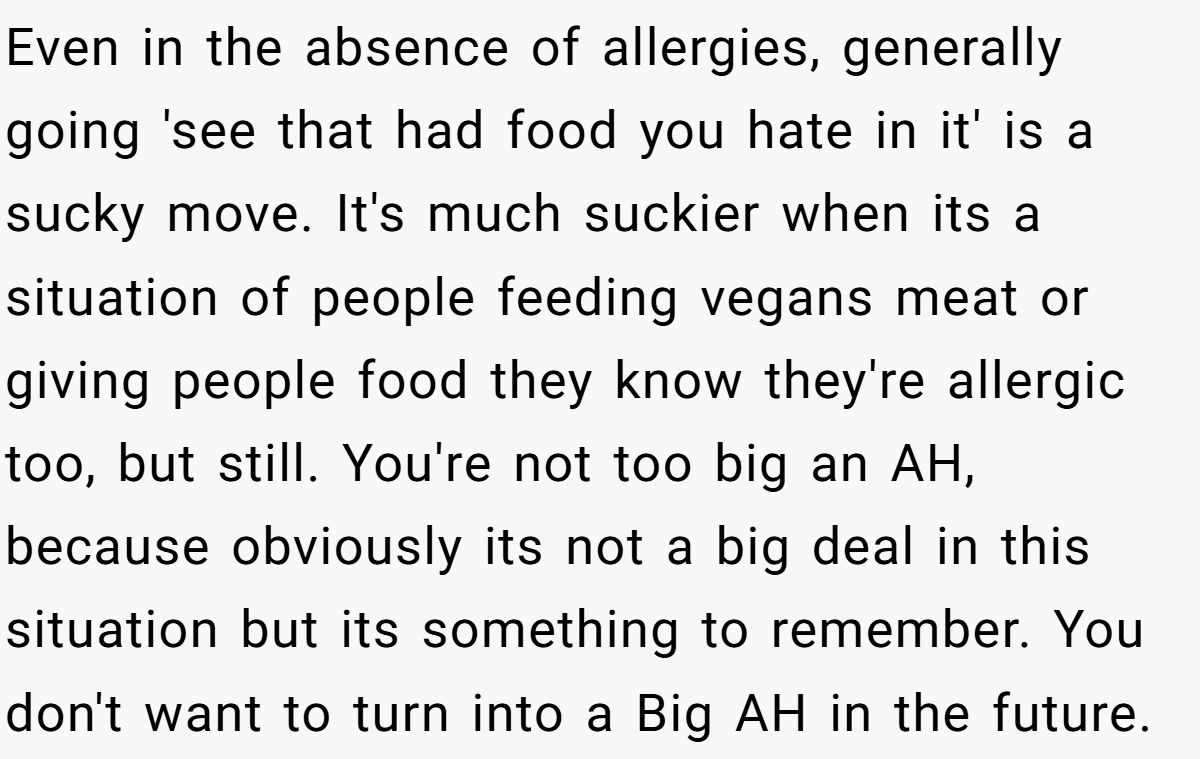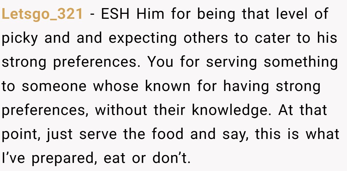 Bottom line: While surprising someone with disliked food isn’t always the best move, demanding gourmet treatment from a fellow teenager is far more entitled. It’s a reminder that respect around food goes both ways—no one should have to tiptoe around a guest’s preferences if that guest refuses to compromise.