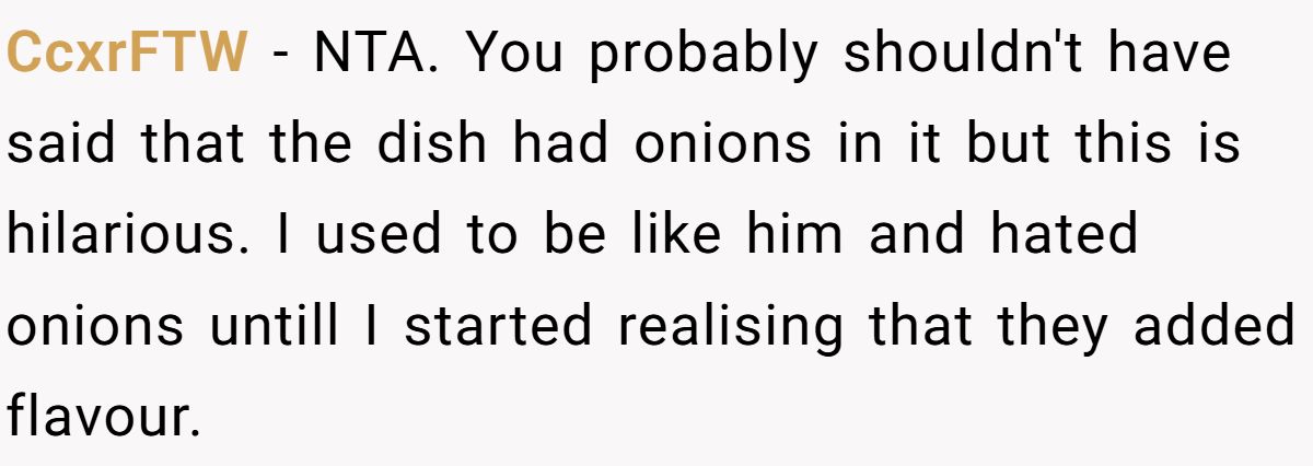 So, was the onion sneak justified or did the teen cross a line? Most agreed the cousin was over-the-top in his demands, but some felt OP could’ve spared him the “gotcha.” Still, when one ingredient creates chaos and parents get involved, maybe it’s not really about the onions.