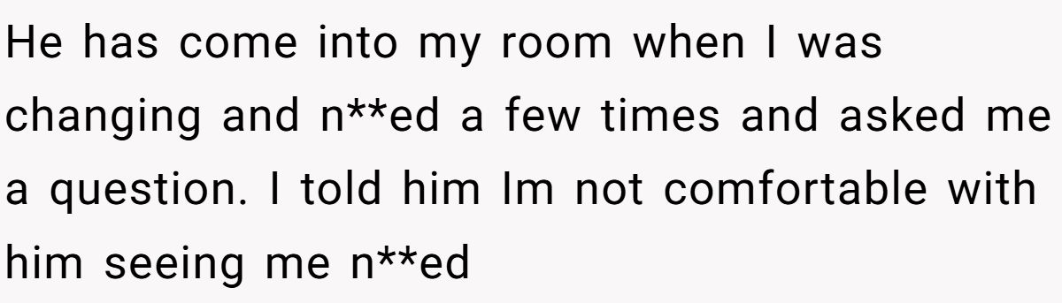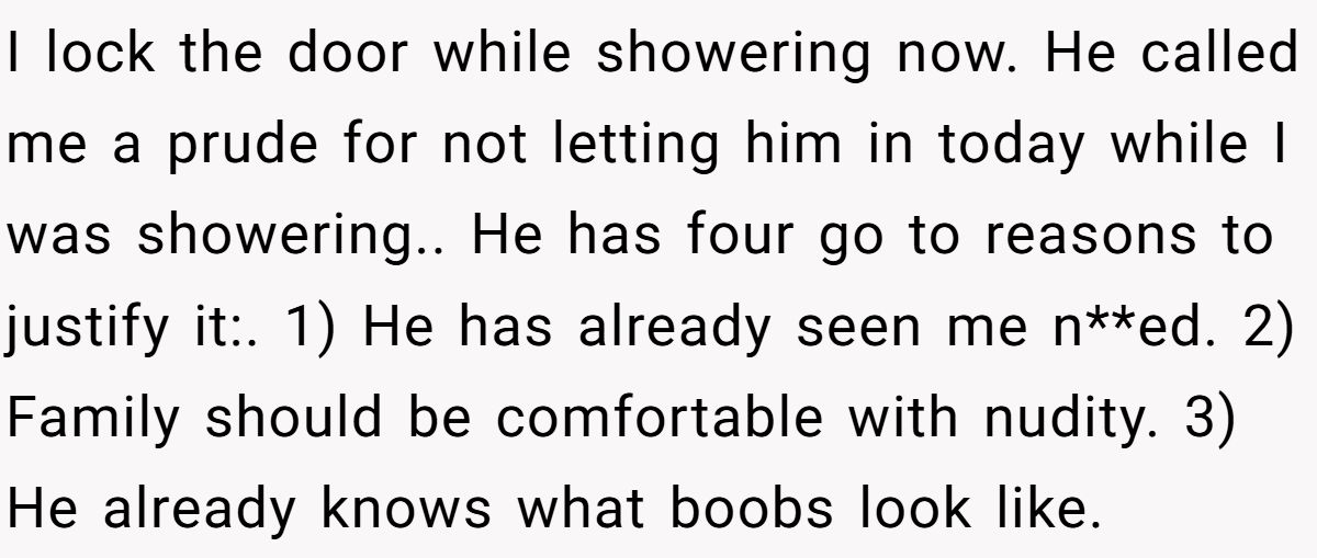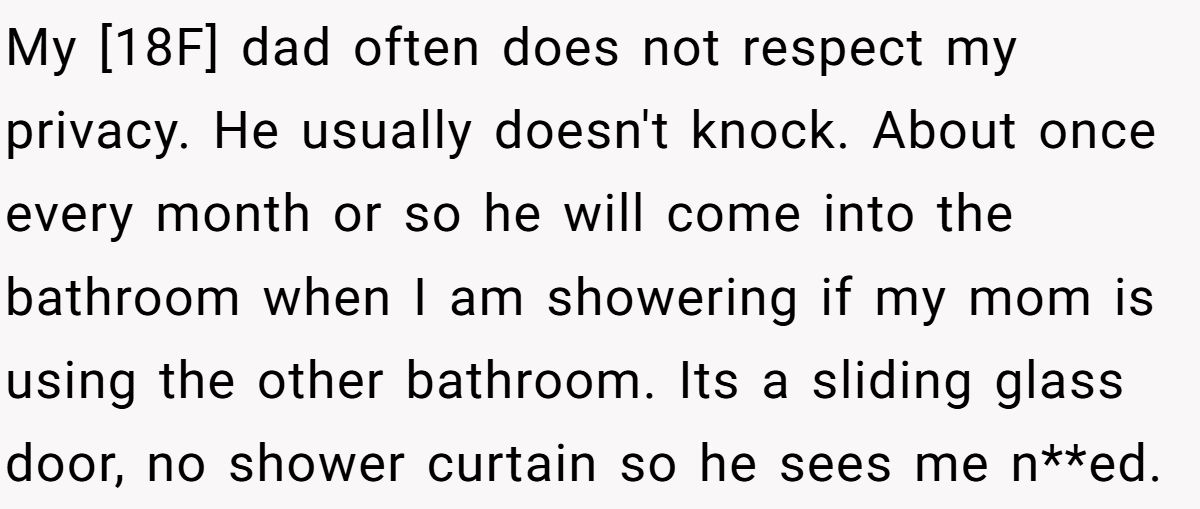 Living at home, she’s been trying to draw clear lines about her personal space, especially when it comes to using the bathroom. But her father doesn’t see a problem. He’s walked in on her changing, entered the bathroom while she was showering behind a clear glass door, and casually dismissed her discomfort with remarks like, “You’re being a prude” or “It’s not a big deal, I’ve seen it all before.”