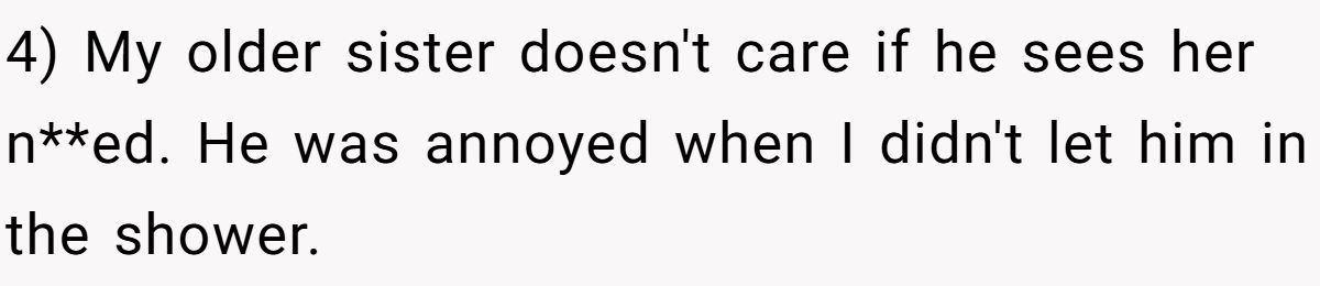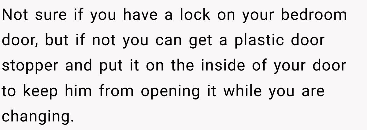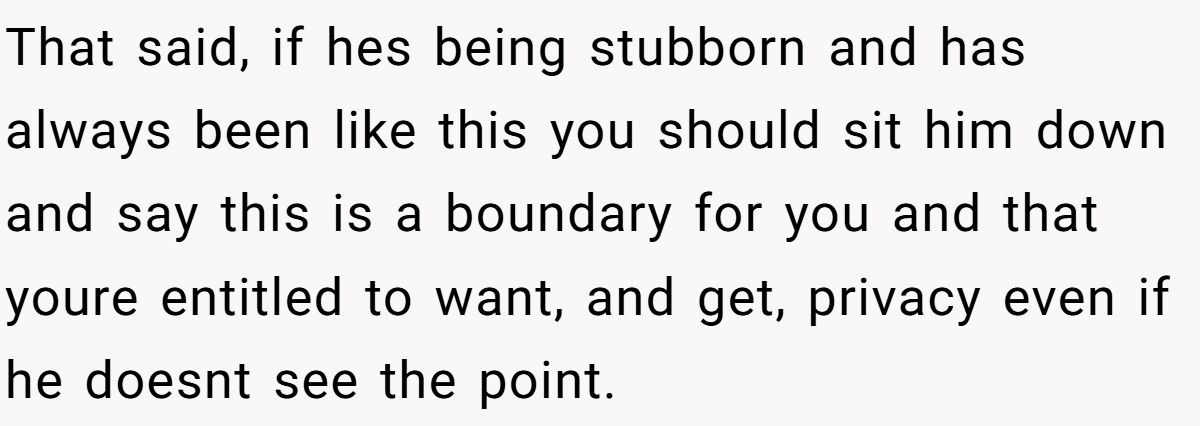 But instead, he treats the bathroom door like it’s a minor inconvenience. He’s walked in while she was rinsing shampoo from her hair, fully visible behind the glass. He’s opened her bedroom door while she was undressing. And every time she’s tried to explain why this felt so violating, he’s waved it off as a silly overreaction.