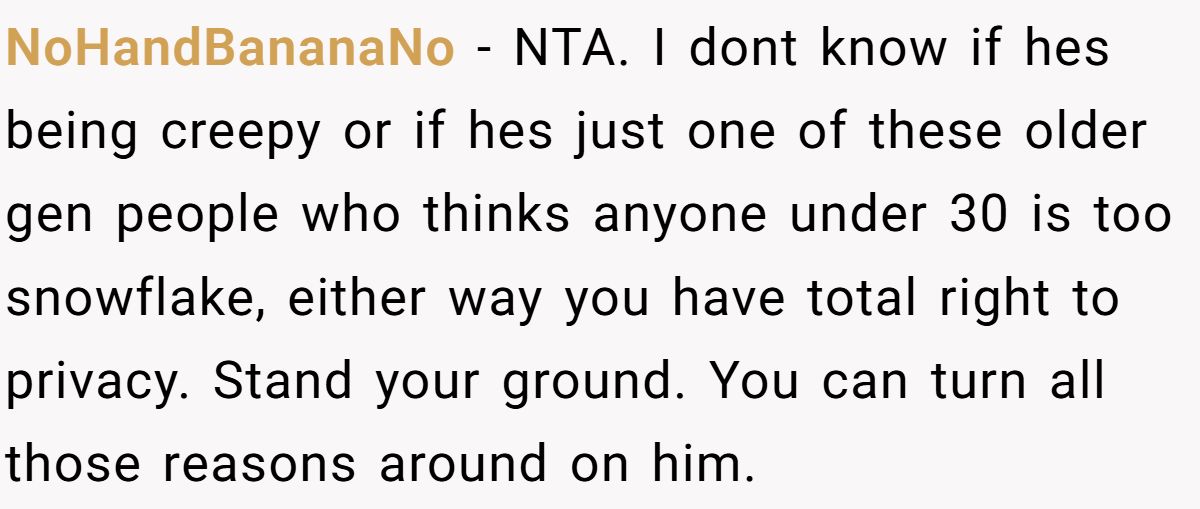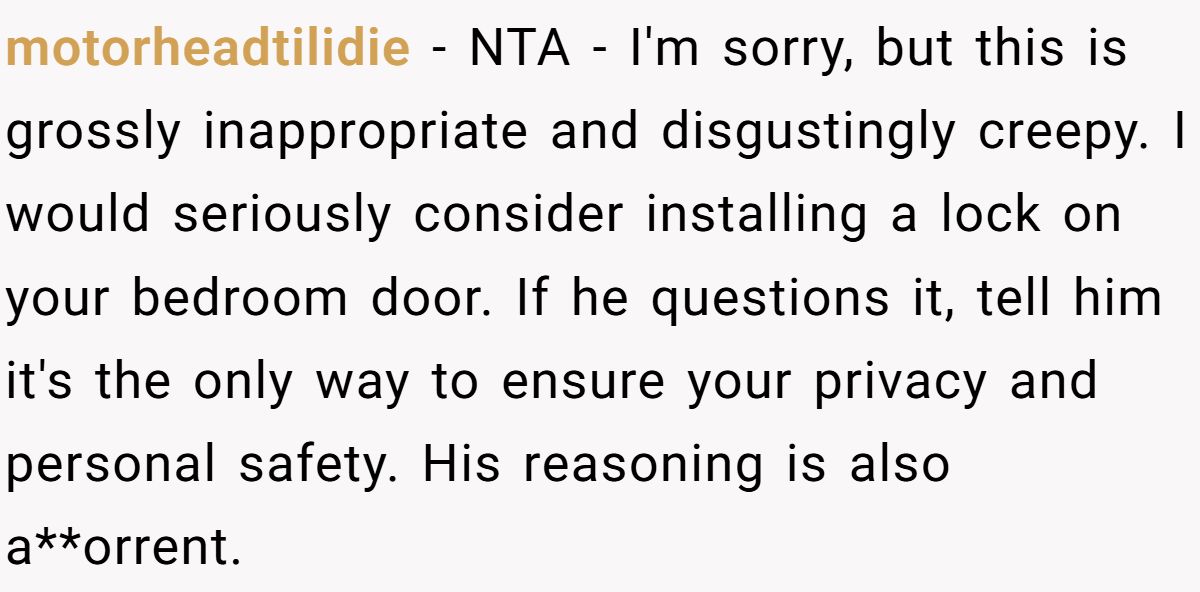 Most commenters agreed she wasn’t overreacting at all, calling her dad’s fixation on the unlocked bathroom door unsettling and a clear violation of her right to privacy.