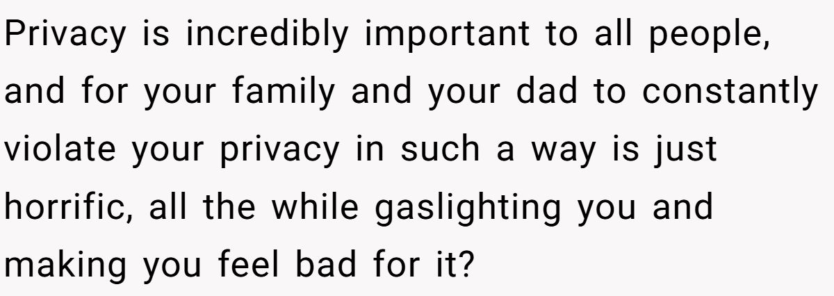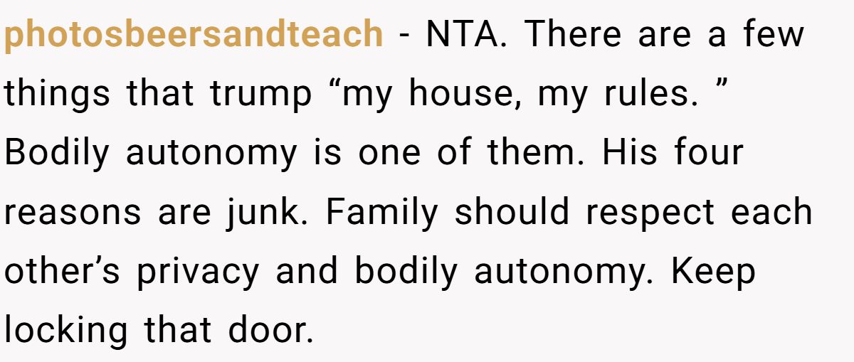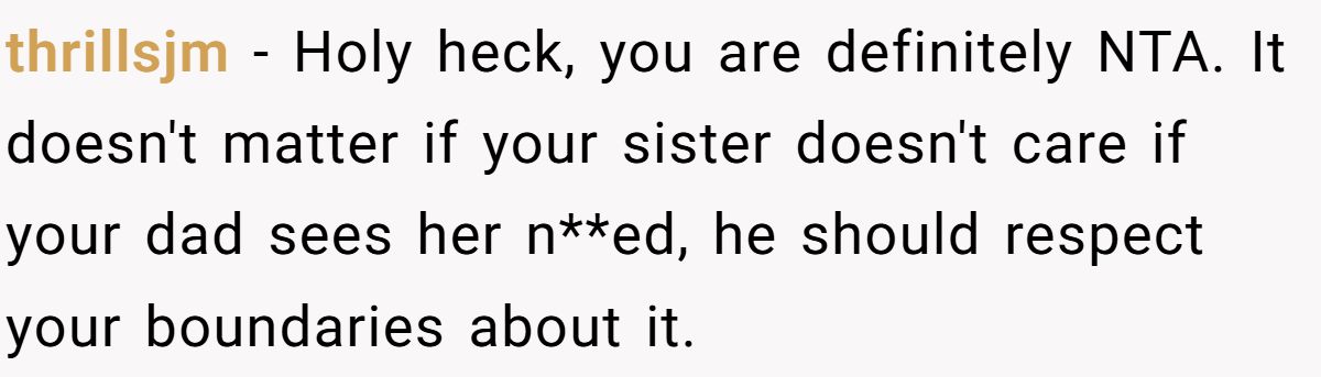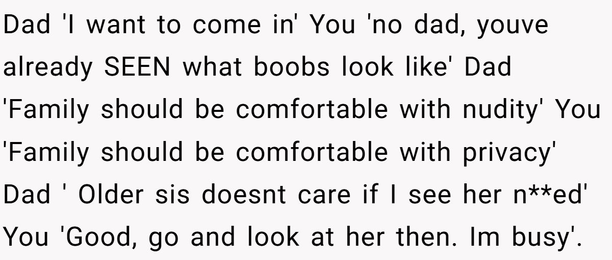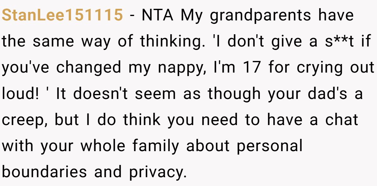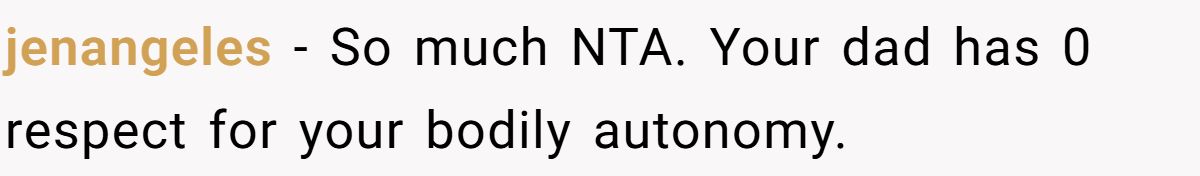 Others strongly agreed she wasn’t wrong, saying her dad showed no respect for her privacy and that bodily autonomy should always come before household rules.