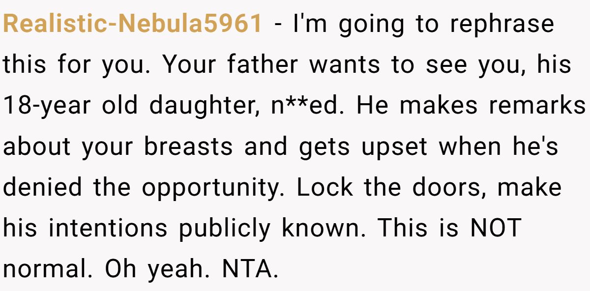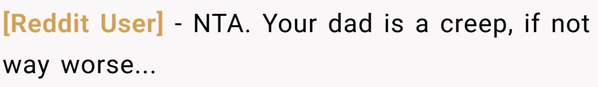 Commenters were outraged, with many calling the father’s behavior disturbing and urging the teen to set firm boundaries, some even warning it bordered on abuse.