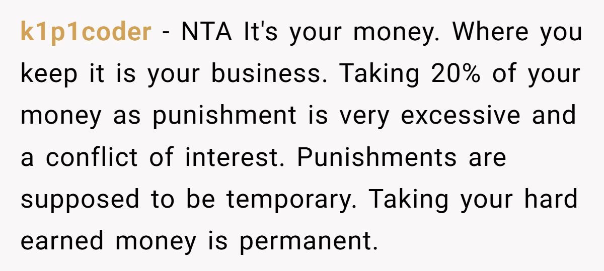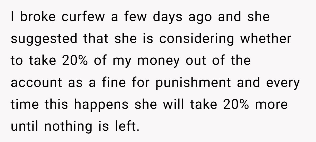 The stepmother’s threat wasn’t just excessive—it bordered on financial abuse, as taking a permanent 20% of earned money far exceeds reasonable discipline. The Redditor’s quick thinking, enlisting her brother to open a new account, protected her funds and set a firm boundary.