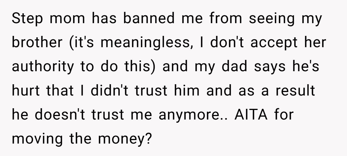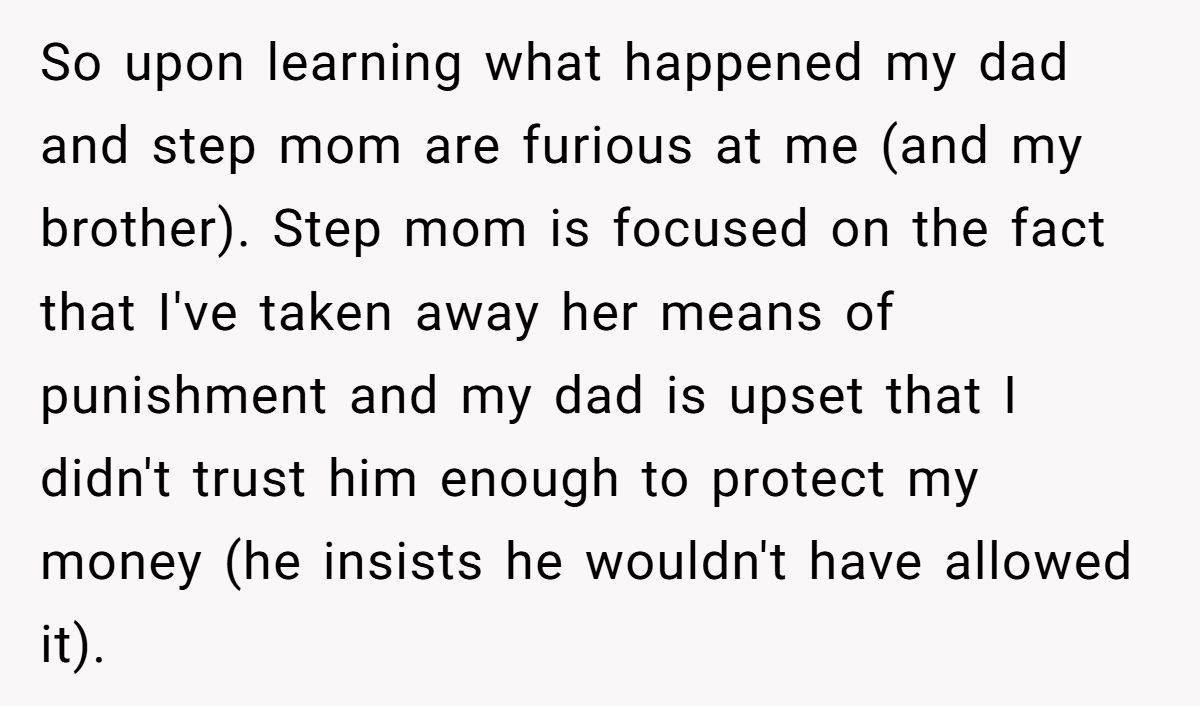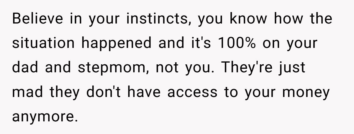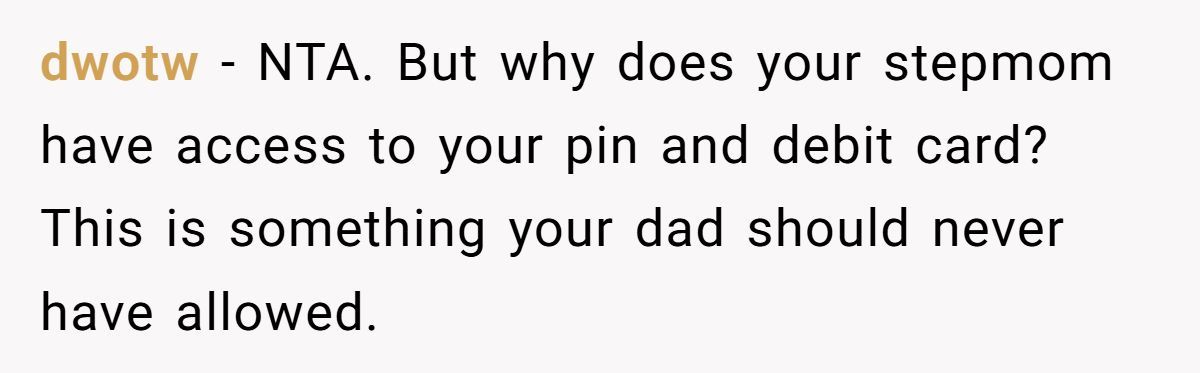 The broader issue is navigating parental authority in blended families. The Redditor could calmly explain to her dad that her move was about protecting her earnings, not distrusting him, while urging him to clarify the stepmother’s role in discipline. Maintaining ties with her brother as a trusted ally is key, and she should keep her account secure. How do you protect your finances from family overreach as a teen?