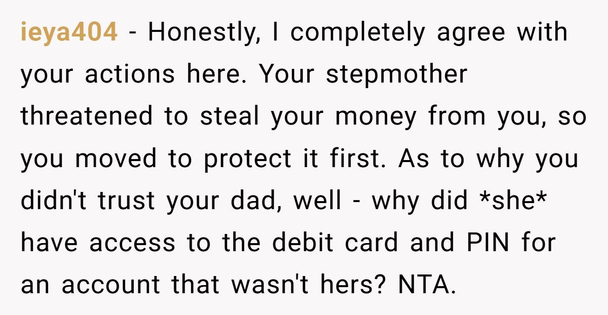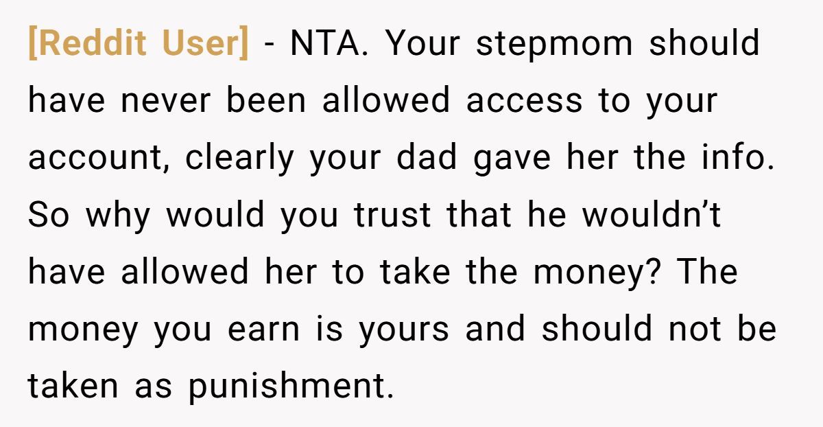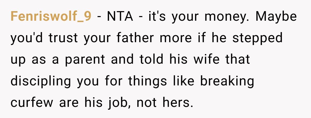This 15-year-old Redditor was absolutely justified in moving her self-earned money to a new account after her stepmother threatened to take 20% as a curfew-breaking penalty, with escalating fines for future infractions. The stepmother’s access to the joint account’s debit card and PIN, coupled with her bold threat, gave the teen every reason to act fast. Her dad’s claim that he “wouldn’t have allowed it” rings hollow since he failed to shut down the threat immediately, leaving her vulnerable.