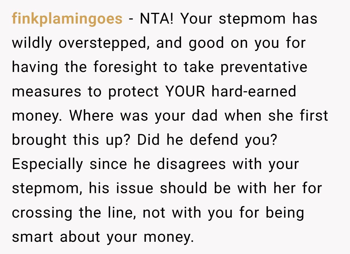 This teen’s bold move to protect her hard-earned money from her stepmother’s punitive threat sparked family fury, but Reddit cheers her savvy decision. Her dad’s hurt feelings and stepmother’s outrage don’t outweigh her right to secure her funds.