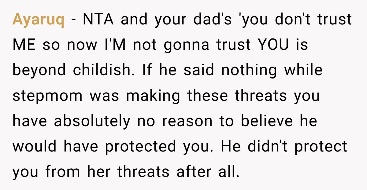 Dr. John Townsend, a family dynamics expert, emphasizes, “Teens need parents to model trust, not control, to build healthy boundaries”. The dad’s hurt feelings and stepmother’s ban on seeing her brother reflect their frustration at losing control, not her lack of trust. Her dismissal of the stepmother’s “authority” shows a healthy instinct to reject overreach, though her dad’s DARVO-like response (Deny, Attack, Reverse Victim and Offender) risks guilting her into compliance.