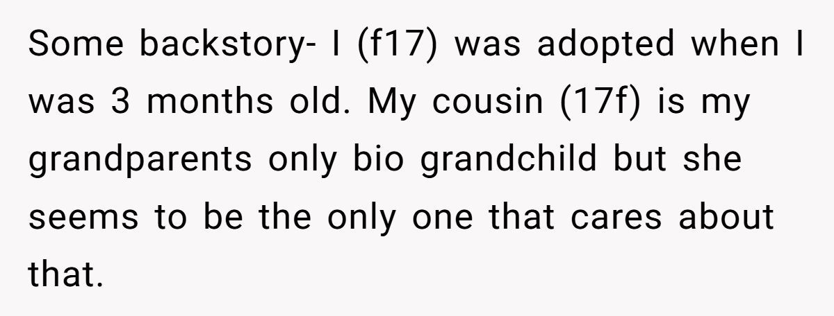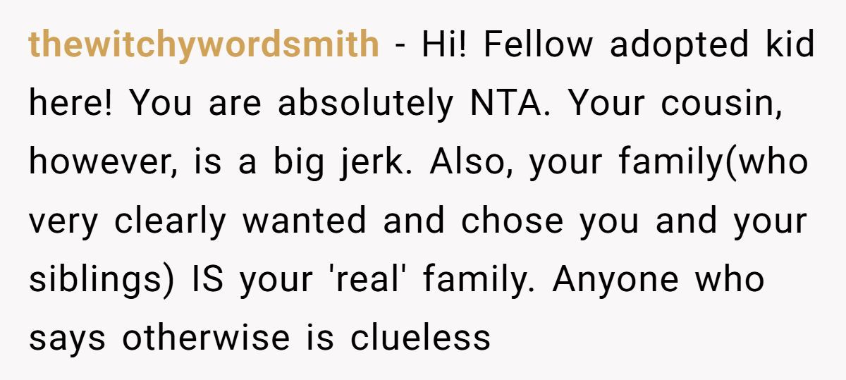 A fellow adoptee called the cousin a “jerk,” questioning if her parents enable her behavior