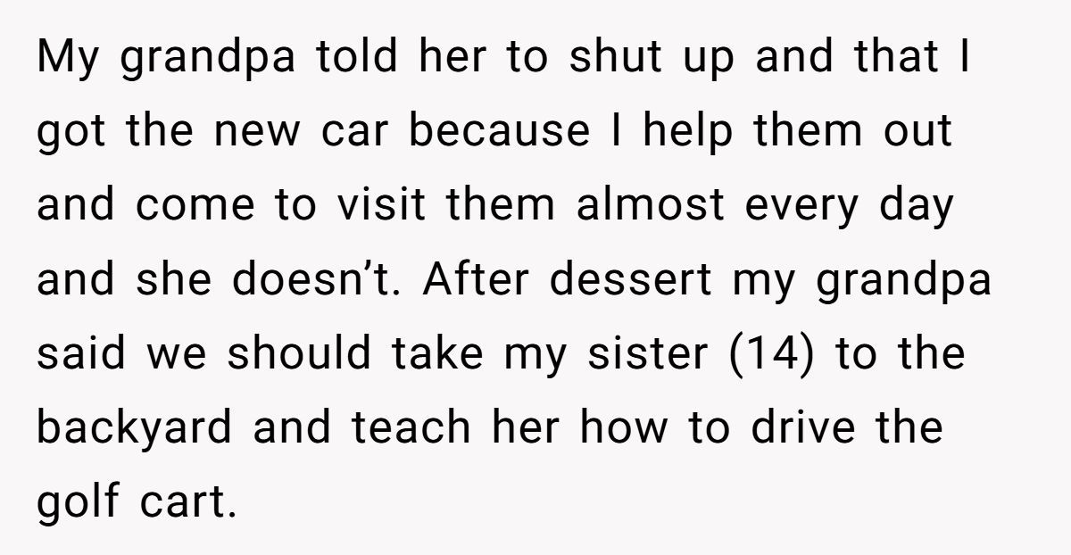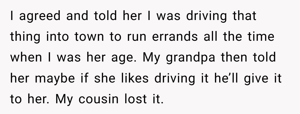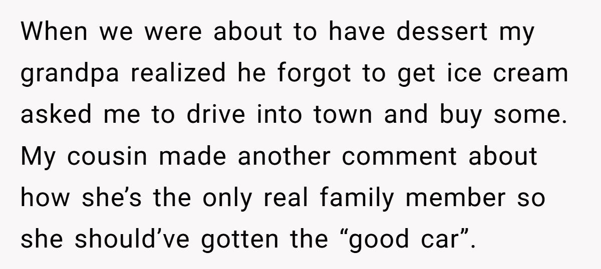 From a psychological standpoint, it’s likely the cousin resents not just the OP, but also her own emotional distance from their grandparents. She isn’t really mad about the car or the golf cart—she’s hurt about being overshadowed, and unfortunately, the OP is a convenient scapegoat.