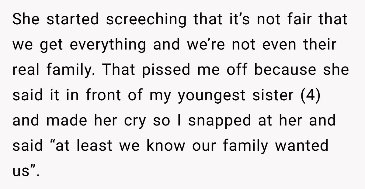 When children—adopted or not—are constantly undermined by family, the damage can ripple for years. Which is why open conversations and boundary-setting are essential. No one should be made to feel “less than” because their family chose them. And for those who witness this kind of emotional manipulation in their own homes? Take notes: silence protects no one.