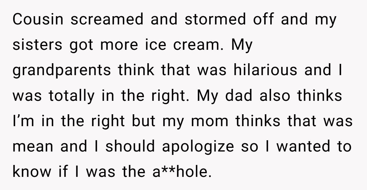 One Redditor bluntly labeled the cousin a “little brat” who had it coming