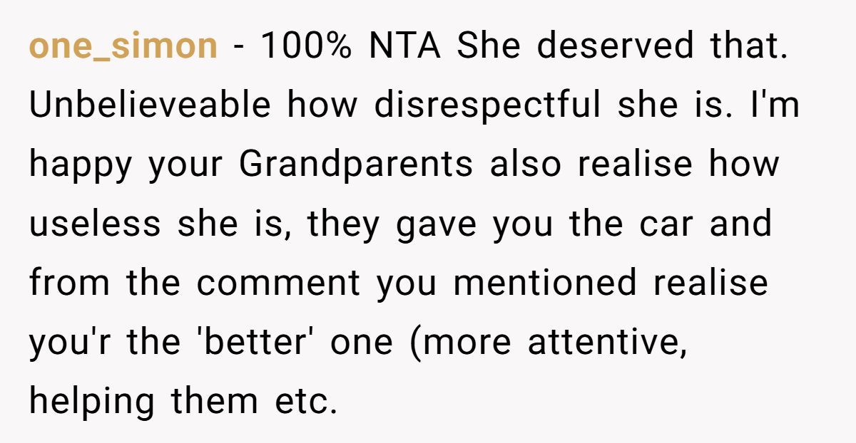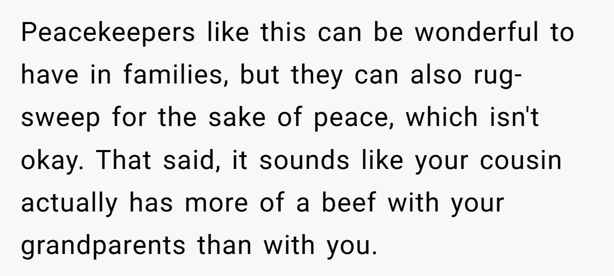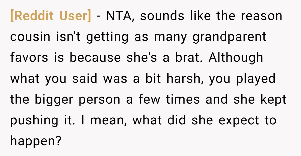 This user called the response justified but suggested the cousin’s real issue lies with her grandparents’ favoritism