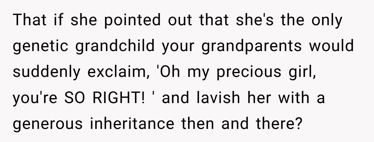 This commenter noted the cousin’s bratty attitude likely cost her grandparent favors, not her biology
