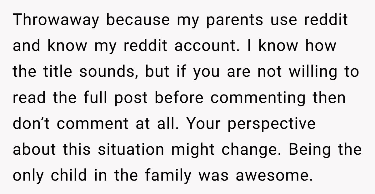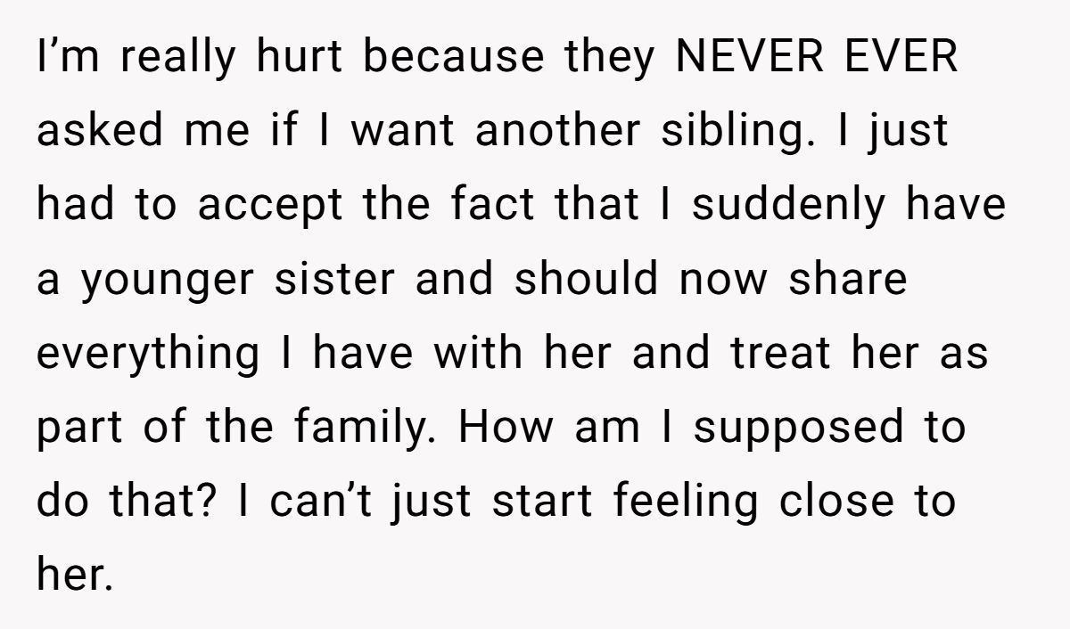 A Redditor walked into a family fiasco that’d make your popcorn pop. One minute she was the only child basking in the glow of undivided attention, the next she was being asked to split her world—room, friends, activities—with a new sibling she didn’t ask for. Sounds like a modern fairy tale gone sideways.