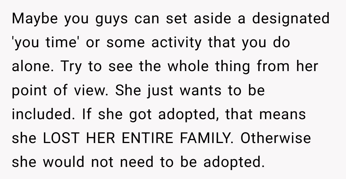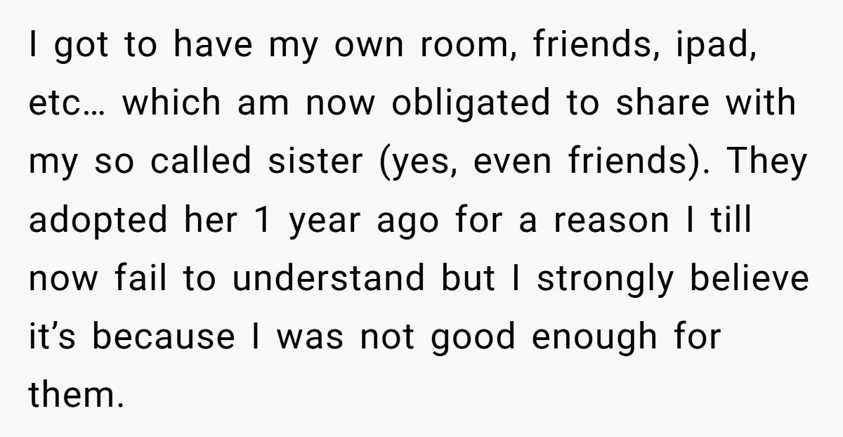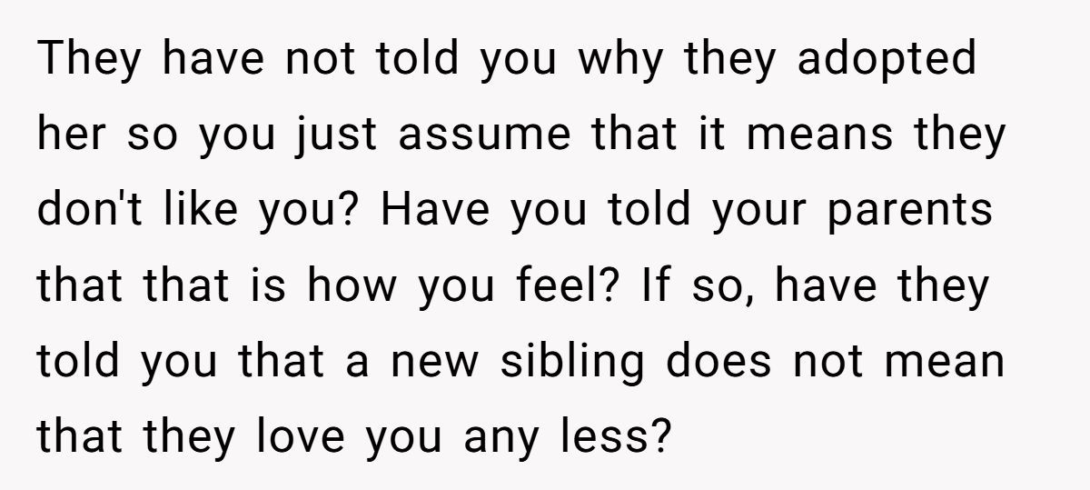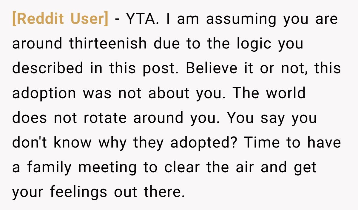 This Reddit poster’s resentment isn’t uncommon. According to family psychologist Dr. Laura Markham, “Children who are expected to instantly bond with adopted siblings often experience a form of displacement grief.” In simple terms: they mourn the life they lost—even if it means giving up a solo spot on the family stage.