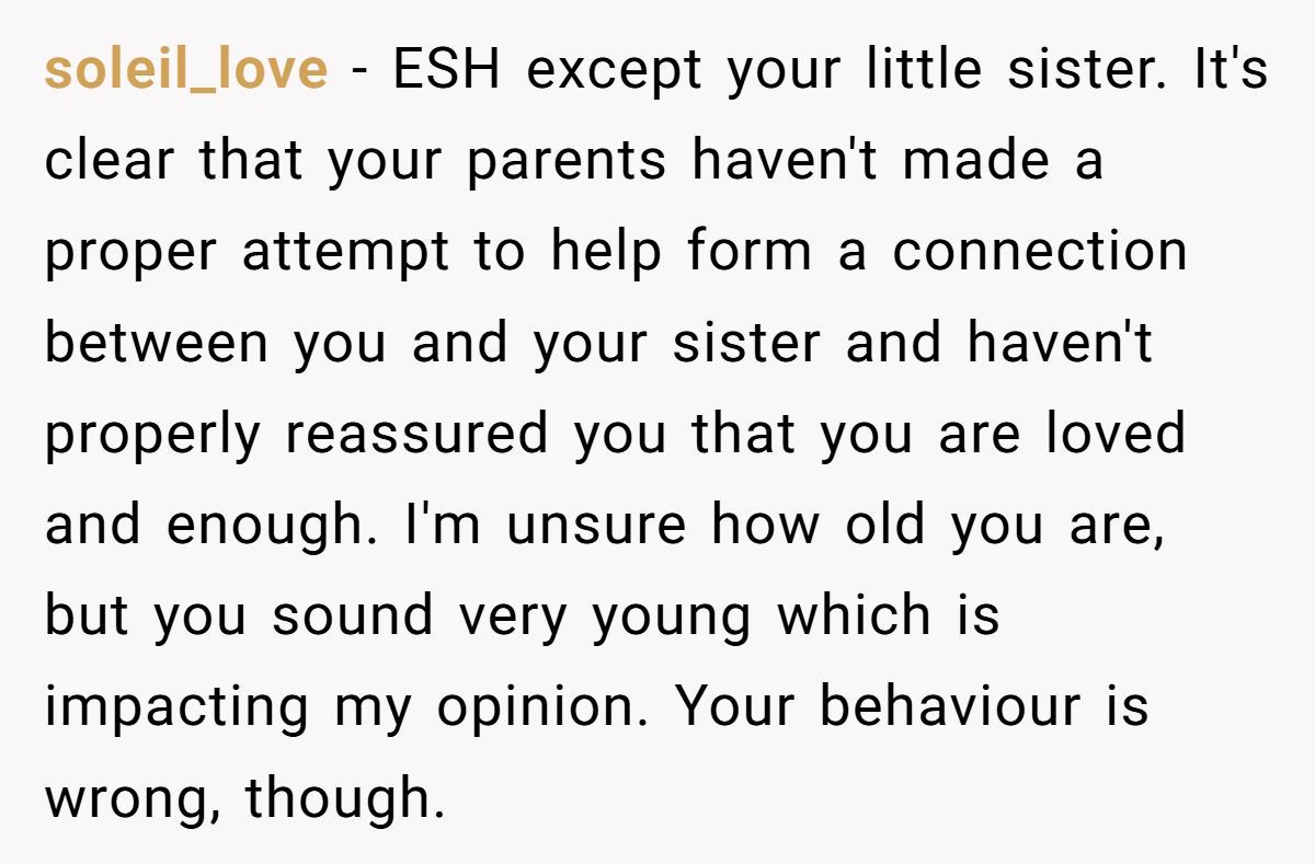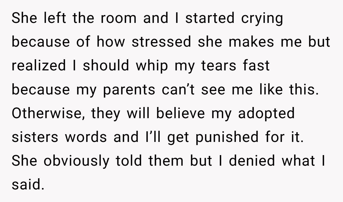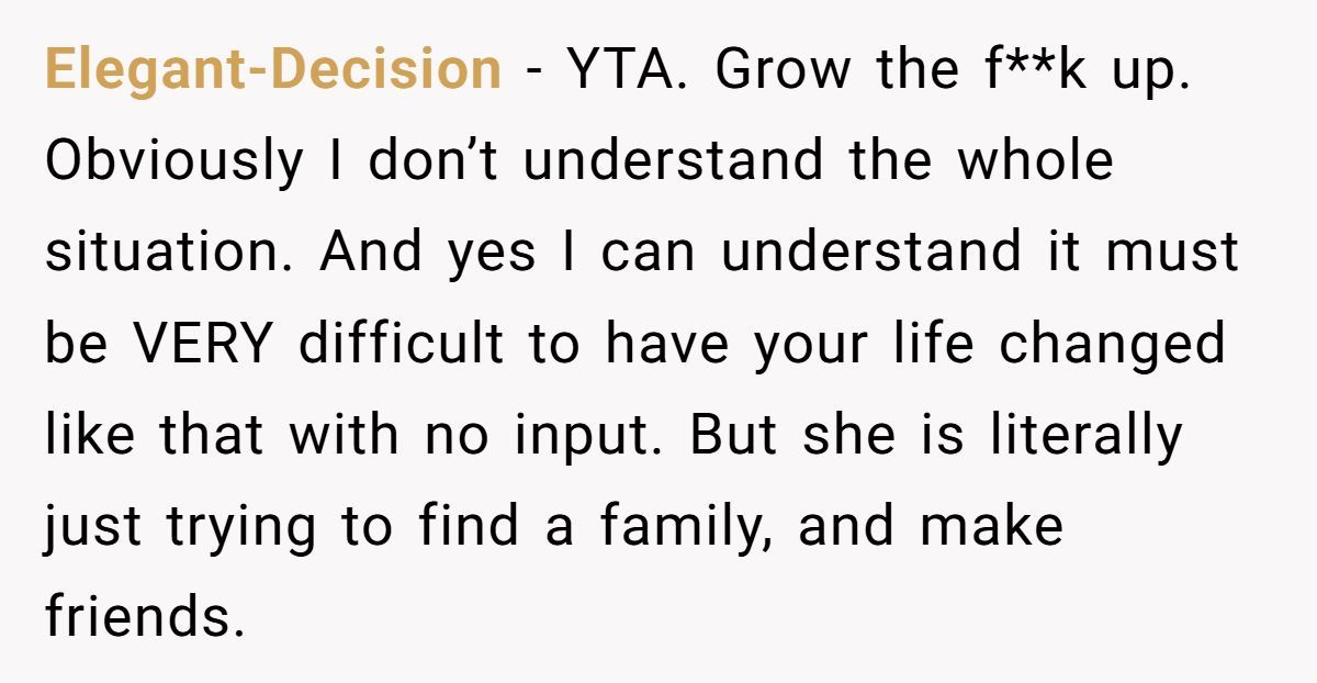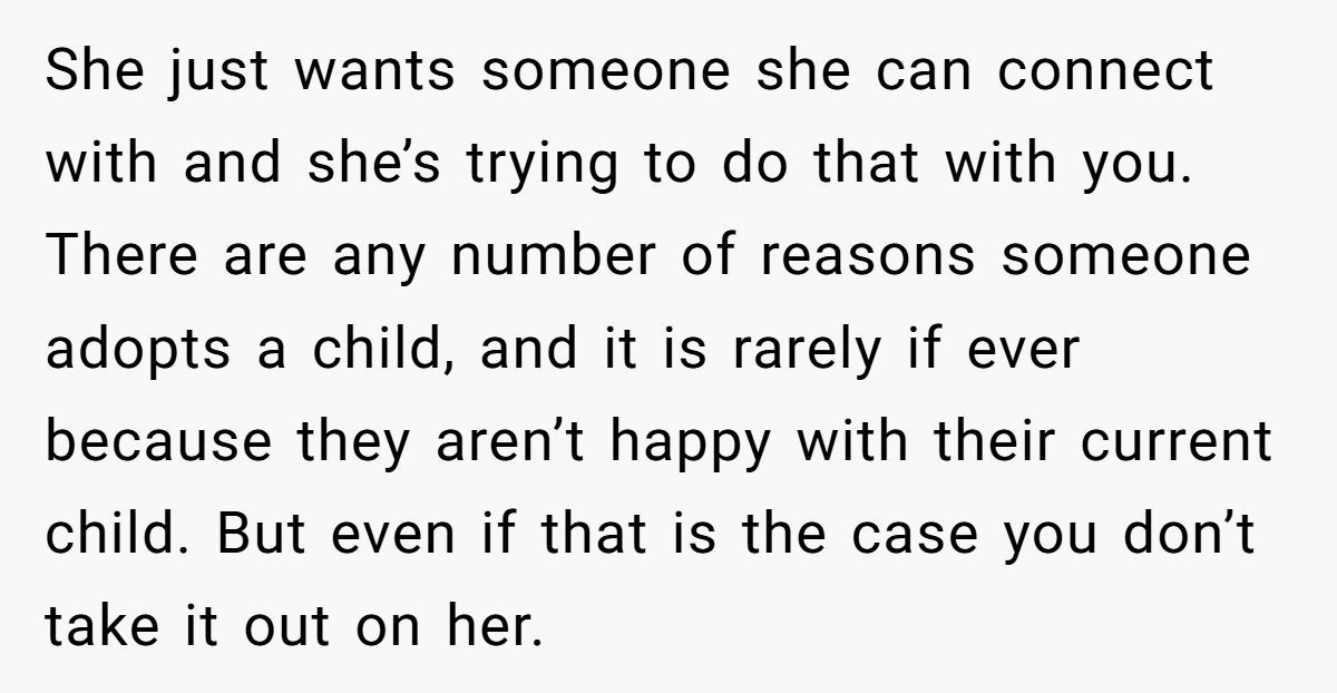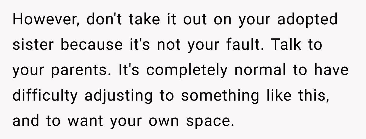 This isn’t about blame—it’s about missed opportunities. This girl isn’t evil. She’s overwhelmed, and her parents may have unintentionally skipped the emotional prep work. On the flip side, the adopted sister didn’t choose to be the target of unresolved grief, either.
