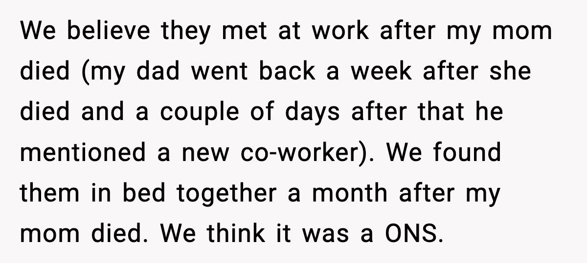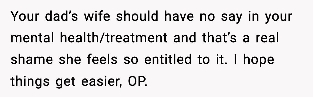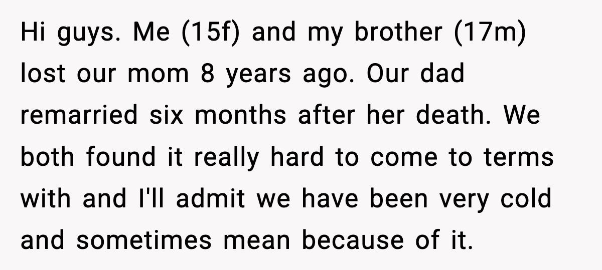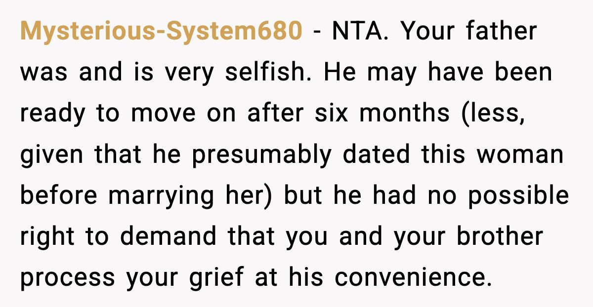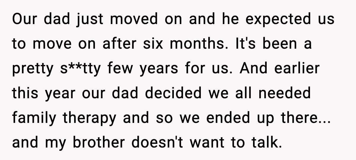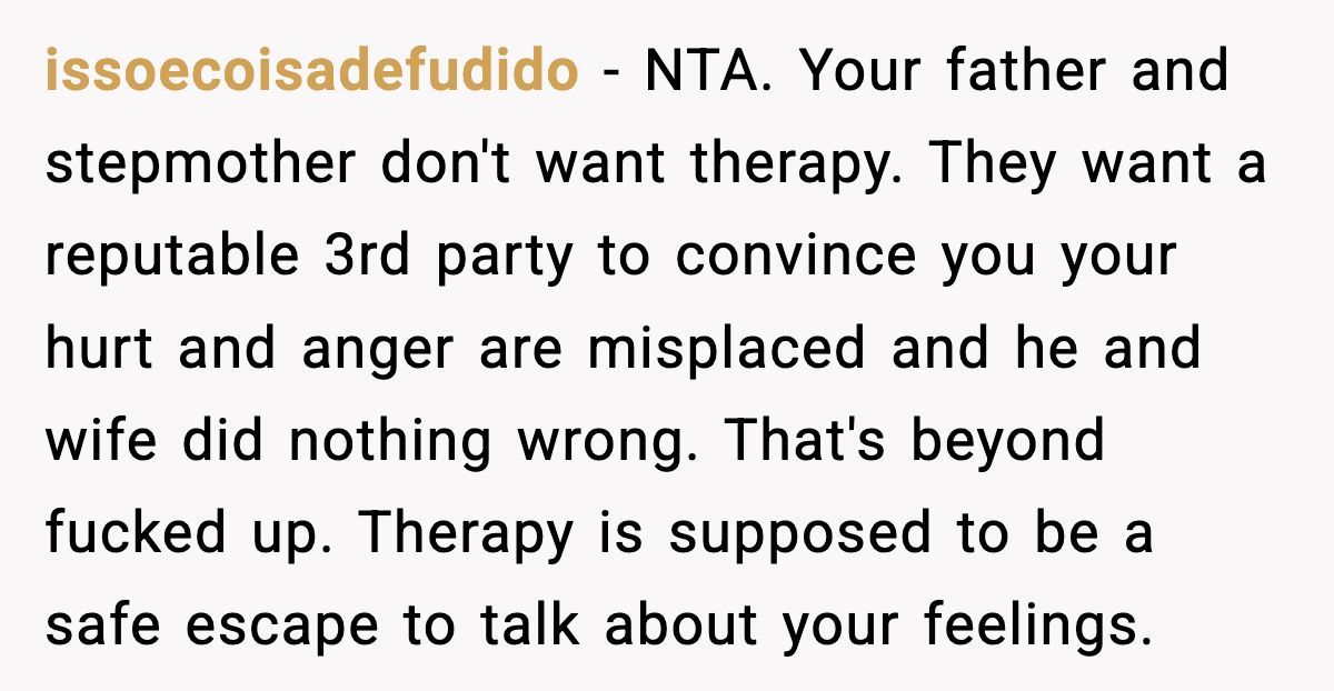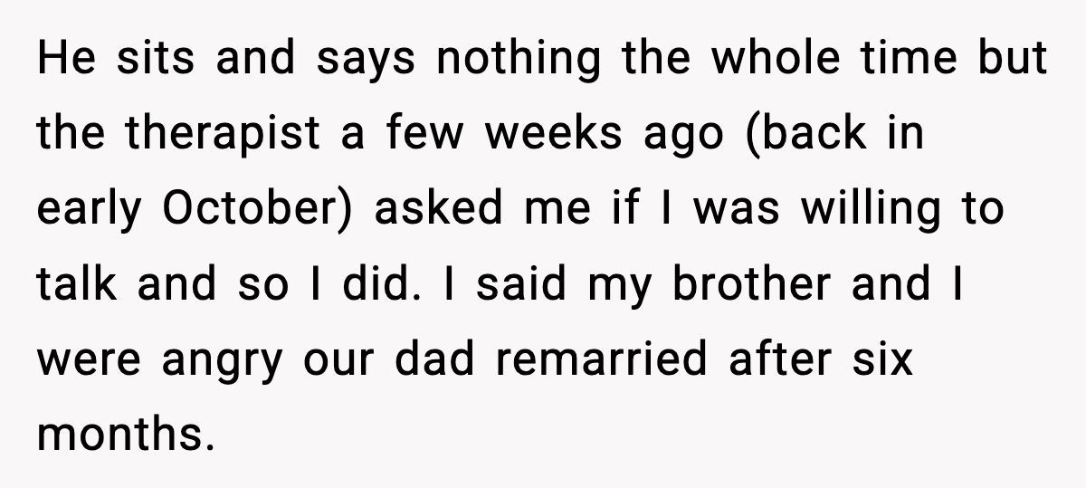 The Redditor’s dad seems to have prioritized his emotional needs while minimizing his children’s mourning process. By introducing a new partner and expecting immediate acceptance, he bypassed their grief. When the stepmother vetoed individual therapy sessions, she overstepped a boundary that even trained therapists respect. That decision undermines the whole point of therapy.