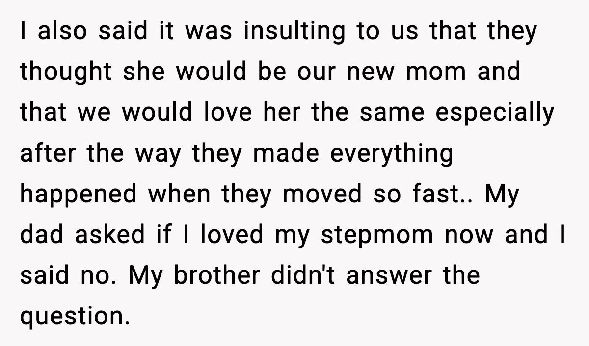In truth, these kids didn’t need a new mom—they needed time, patience, and space. Love can’t be mandated, especially in the wake of trauma. The father and stepmother’s insistence on a “happy family” narrative seems less about unity and more about control.